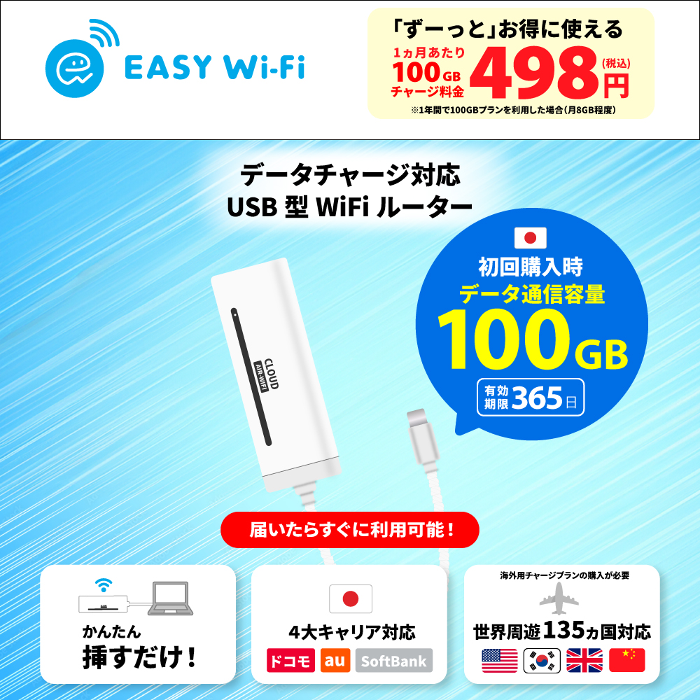 ●【日本国内100GBデータ+端末セット商品】データの有効期限は、初回通信日から365日間です。