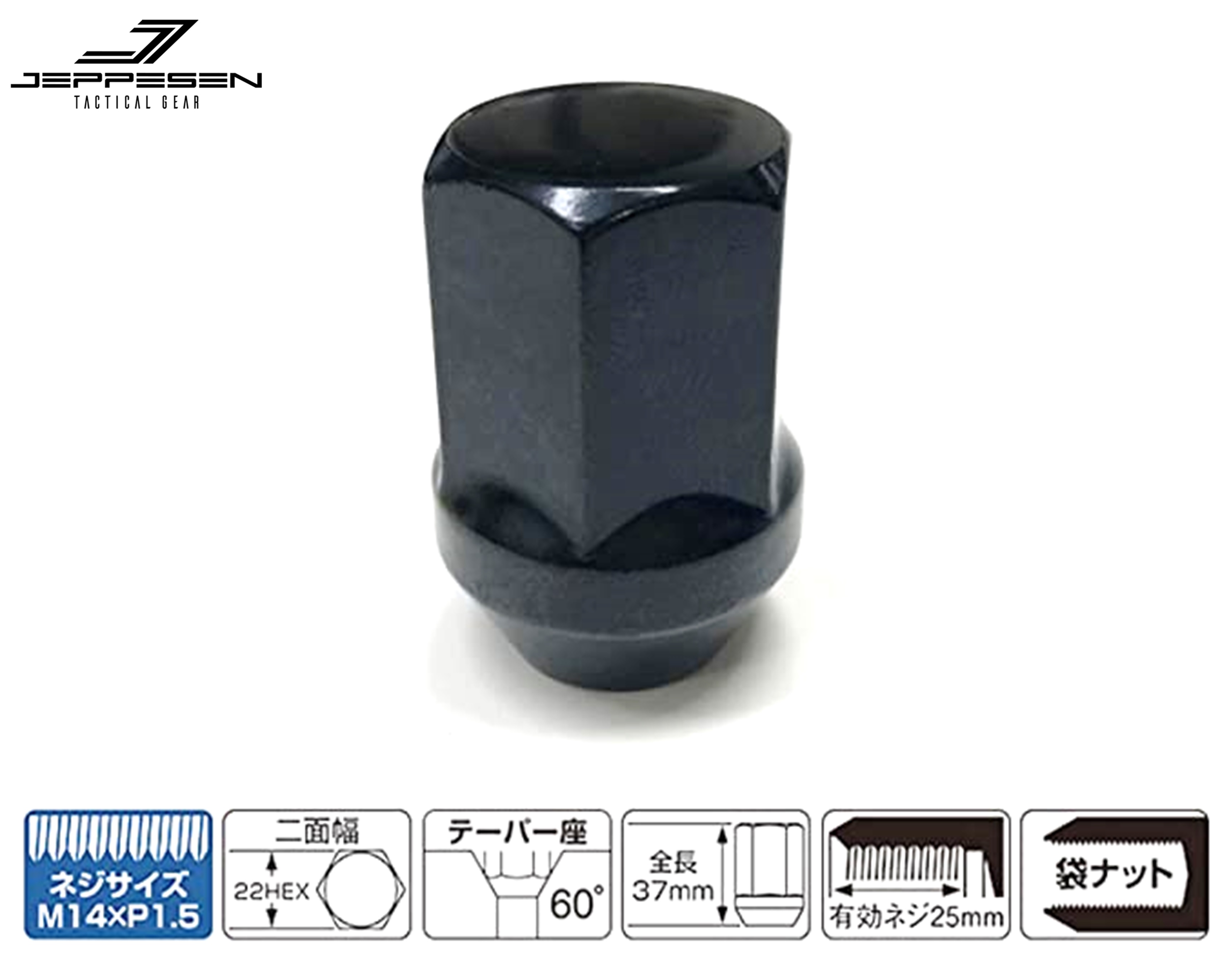 TUS JAPAN JEPPESEN【ジェップセン】ブラック ラグナット JEEP ラングラー(JL)サイズ:M14xP1.5 22HEX 60°テーパー ※1個〜数量選択可能