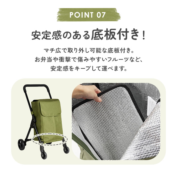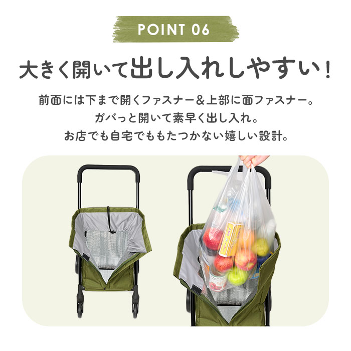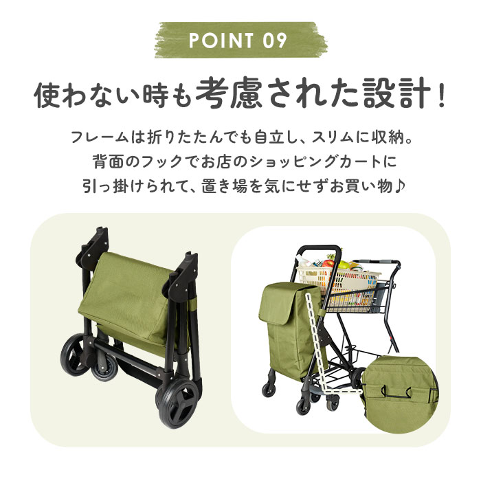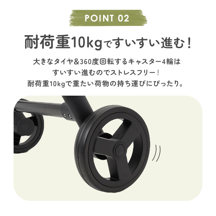 | 【荷物をラクに運べる心強い味方】 ・いつものお買い物が、グンと快適に☆デイリーに使える「cocoro 前押し4輪カート」。 【より少ない負担で1度に運べる◎】 ・腕への負担を軽減する前押しタイプ。後方を気にせず歩けて、週末のまとめ買いにもおすすめ。 【女性でも持ち運びやすい軽量設計】 ・本体の重さは約2.5kg。女性や高齢の方も持ち運びやすい軽くて丈夫なスチール製フレーム。 【ドローコード&フラップのダブル】 ・開口部はドローコードをキュッと絞るタイプ。フラップも付いており、こぼれ落ちをガード! 【フロントファスナーで出し入れ簡単】 ・前面には下まで開くファスナー&上部に面ファスナー。ガバっと開いて素早く出し入れ。 【うれしい保冷・保温機能付き】 ・内側は保冷・保温効果のあるアルミ蒸着フィルム仕様。開口部を閉めれば冷気などを逃さない♪ 【重い飲料やお米などたっぷり収納】 ・約35Lの大容量サイズ!2Lペットボトルも数本収まり、食材もすっきりひとまとめ。 【安定した状態で持ち運び可能】 ・マチ広で取り外し可能な底板付き。お弁当や衝撃で傷みやすいフルーツなども安定感をキープ。 【サッと取り出せる外側ポケット】 ・背面に大きめのポケットを配置。すぐに取り出したい小物を入れておけて便利。 【スムーズに軽がせてノンストレス】 ・大きなタイヤ&360度回転するキャスターの4輪。耐荷重は10kgで、重たい荷物もOK! 【スマートにお買い物できて便利】 ・フレーム背面のフックでお店のショッピングカートに引っ掛け可能。置き場を気にせずお買い物♪ (※1)カートの形状によっては取り付けできない場合があります。 【工具不要でどなたでも簡単セット】 ・タイヤを取り付け、カートを組み立て。バッグをフレームに固定させれば完成。 (※2)バッグにフレーム固定ベルト付き。 【使わない時の収納も省スペース】 ・フレームは折りたたんでも自立し、スリムに収納。自宅での収納に困らないのもポイント。 (※3)バッグを取り付けたままでも折りたたみ可能です。 |