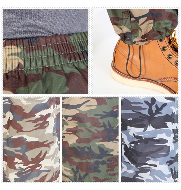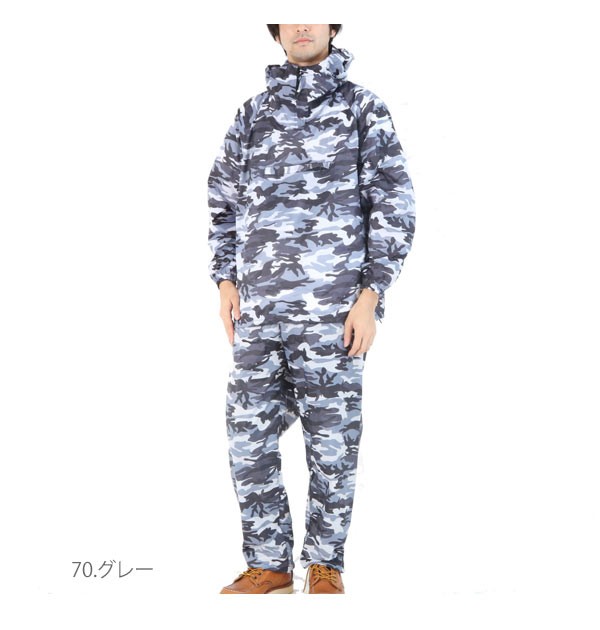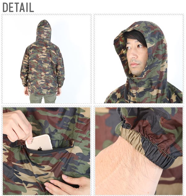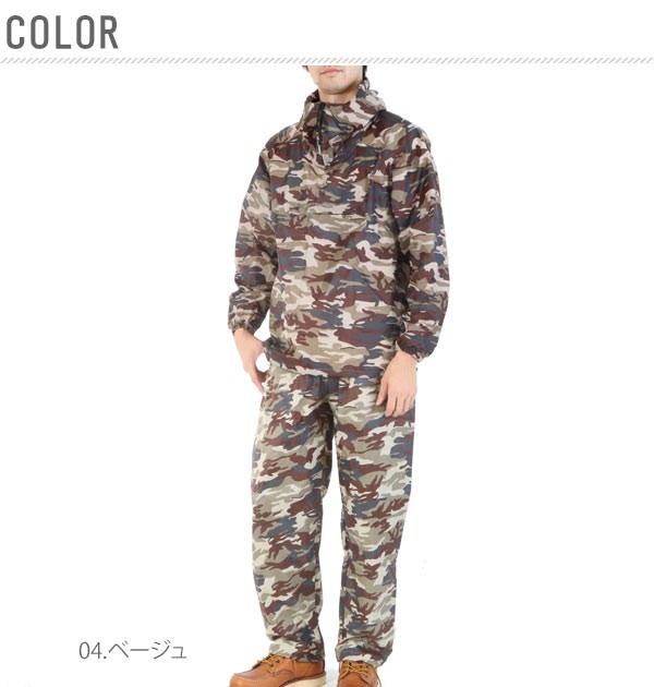 | ナイロン生地を使用でシワになりにくく撥水加工がしてあるので朝露や泥をはじきます。人気の迷彩柄で汚れが目立たず仕事にも普段着にも使えます。ヤッケは頭から被るデザインで、パンツは裾をポッピングスタイル(裾絞り)に出来ます。 |