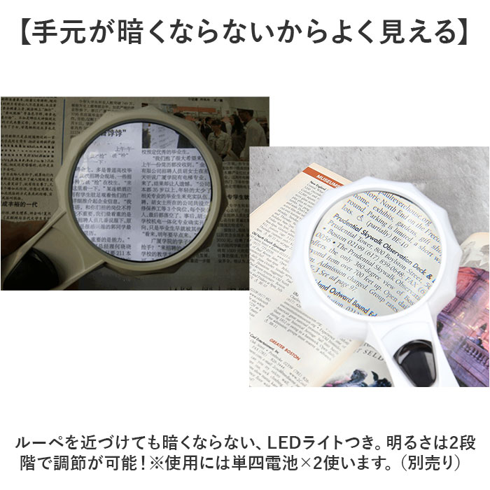 ・ルーペを近づけても暗くならない、LEDライトつき。明るさは2段階で調節が可能!