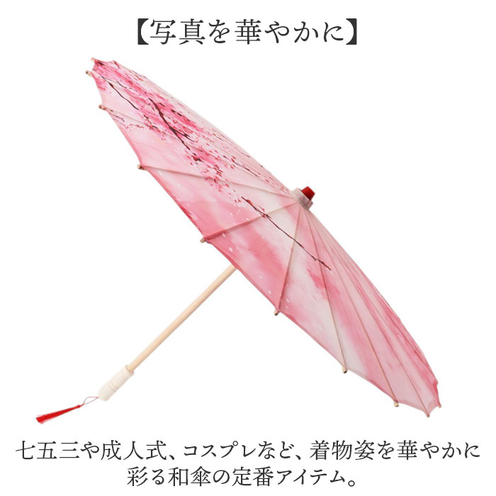 | 【和の演出を楽しむ】 ・趣ある仕上げが魅力。和装の写真撮影にぴったりな和傘が登場。 【写真を華やかに】 ・七五三や成人式、コスプレなど、着物姿を華やかに彩る和傘の定番アイテム。 【丈夫で破れにくい】 ・伝統的な紙張りではなく布張りを採用し、破れにくくしなやかな手触りを実現。 【和にこだわったデザイン】 ・中棒や持ち手、親骨に木製パーツを使い、和のイメージをより深く表現。 【さまざまなシーンで活躍】 ・日本舞踊のお稽古、舞台の小道具、和室のインテリアなど幅広く使える華やかな和傘。 |