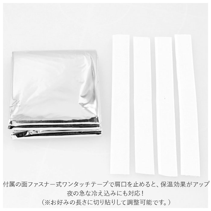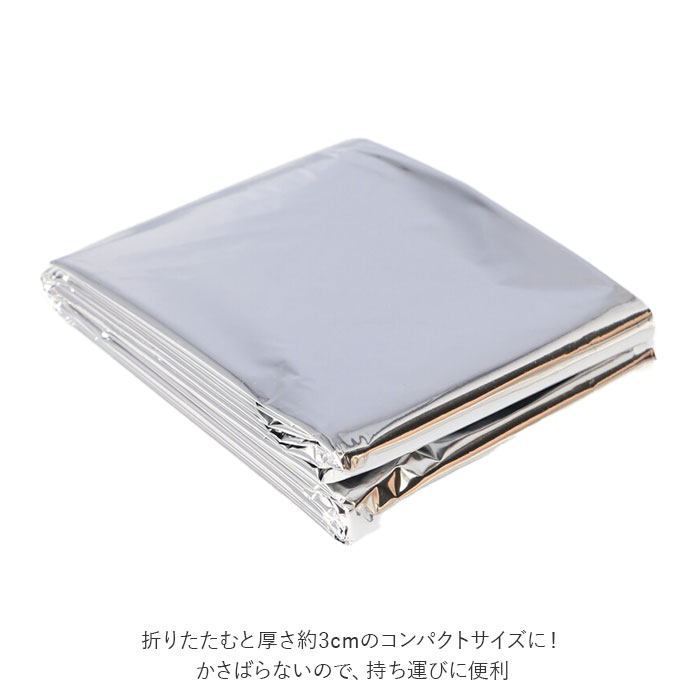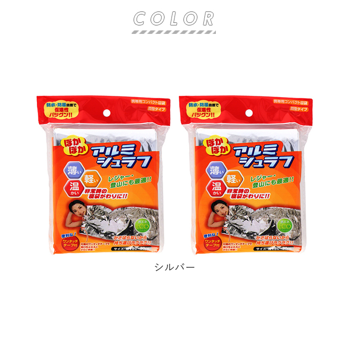 | ※湿気の多い場所や雨の中で使用された場合、シワや折り目などからアルミがはく離し、衣類などに付着する恐れがありますので、ご注意ください。 ※切ったり、穴を開けたりしないでください。 ※炎に近付けないでください。 ※乾燥した場所に保管してください。 ※幼児の手の届かないところに保管してください。 ※カメラやモニターの性質により、画像と実物の色の違いがある場合がございますのでご理解願います。 |