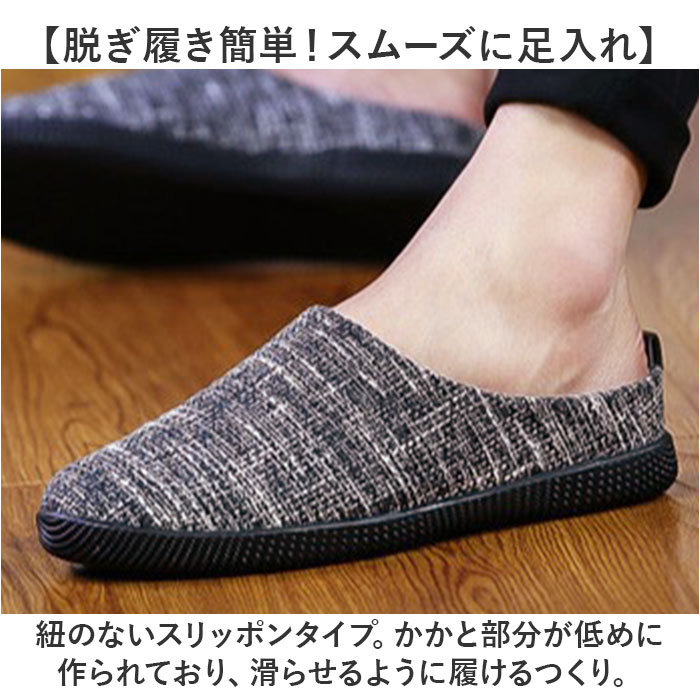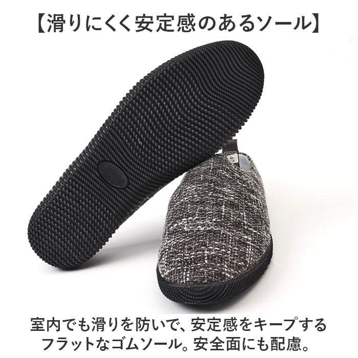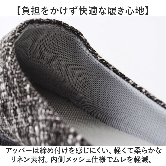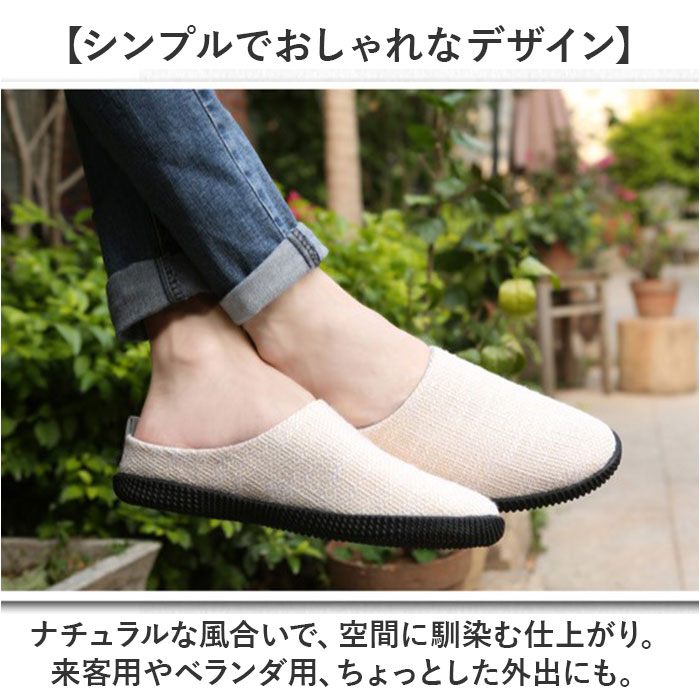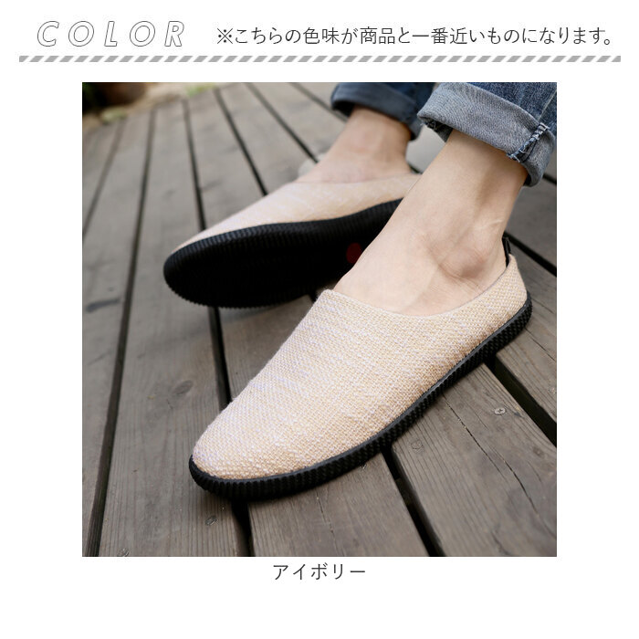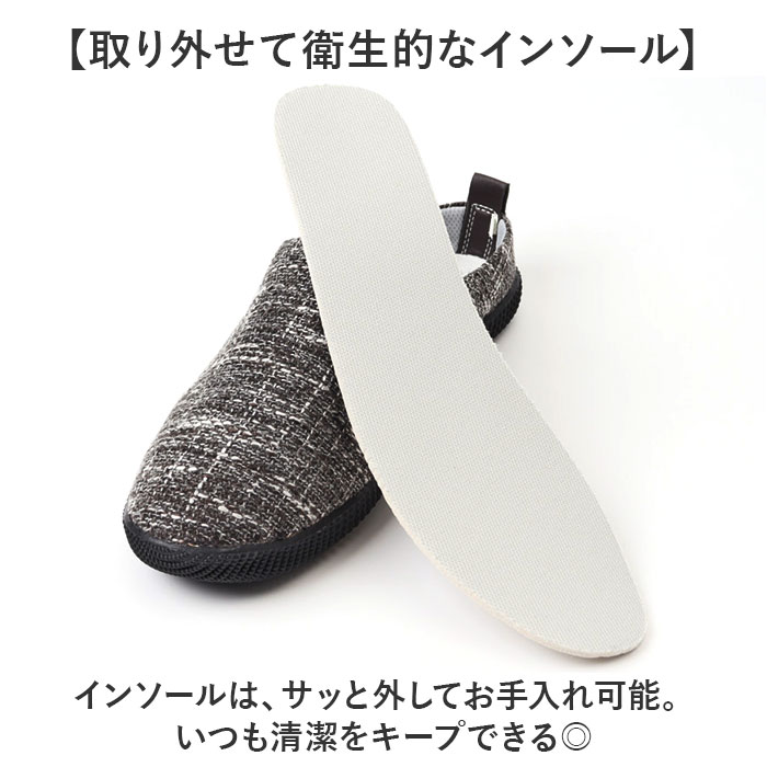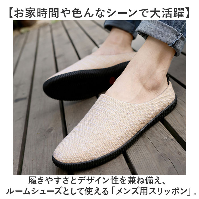 | 【お家時間や色んなシーンで大活躍】 ・履きやすさとデザイン性を兼ね備え、ルームシューズとして使える「メンズ用スリッポン」。 【脱ぎ履き簡単!スムーズに足入れ】 ・紐のないスリッポンタイプ。かかと部分が低めに作られており、滑らせるように履けるつくり。 【負担をかけず快適な履き心地】 ・アッパーは締め付けを感じにくい、軽くて柔らかなリネン素材。内側メッシュ仕様でムレを軽減。 【取り外せて衛生的なインソール】 ・インソールは、サッと外してお手入れ可能。いつも清潔をキープできる◎ 【屈曲性があり歩きやすさが向上】 ・足の動きに合わせて柔軟に曲がる形状。蹴り上げやすくつまずきにくい! 【滑りにくく安定感のあるソール】 ・室内でも滑りを防いで、安定感をキープするフラットなゴムソール。安全面にも配慮。 【シンプルでおしゃれなデザイン】 ・ナチュラルな風合いで、空間に馴染む仕上がり。来客用やベランダ用、ちょっとした外出にも。 |