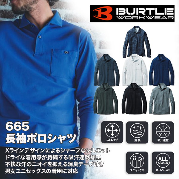 バートル 665 長袖ポロシャツ ユニセックス SS〜3L ドライタッチ鹿の子 接触冷感 消臭テープ付き BURTLE。胸ポケット、袖マルチポケット付き。ストレッチ