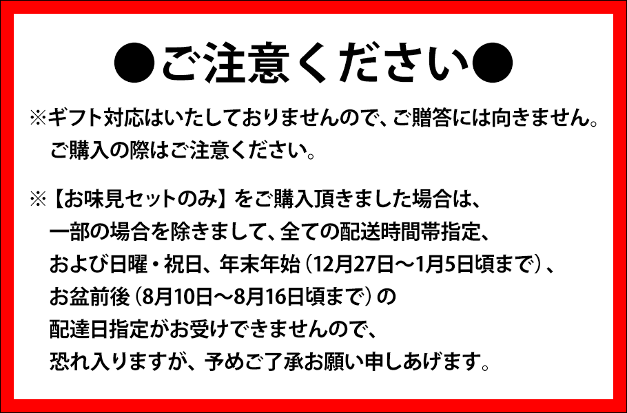 ◆備考 | ※お味見セットのみのご注文の場合、代金引換はできません。 ※のし・掛け紙・包装紙はおつけしておりません。 ※数に限りがありますので、売り切れの節はご容赦ください。 ※商品のお届けまでに多少お時間を頂きます。 ※店舗では取り扱っておりません。 |