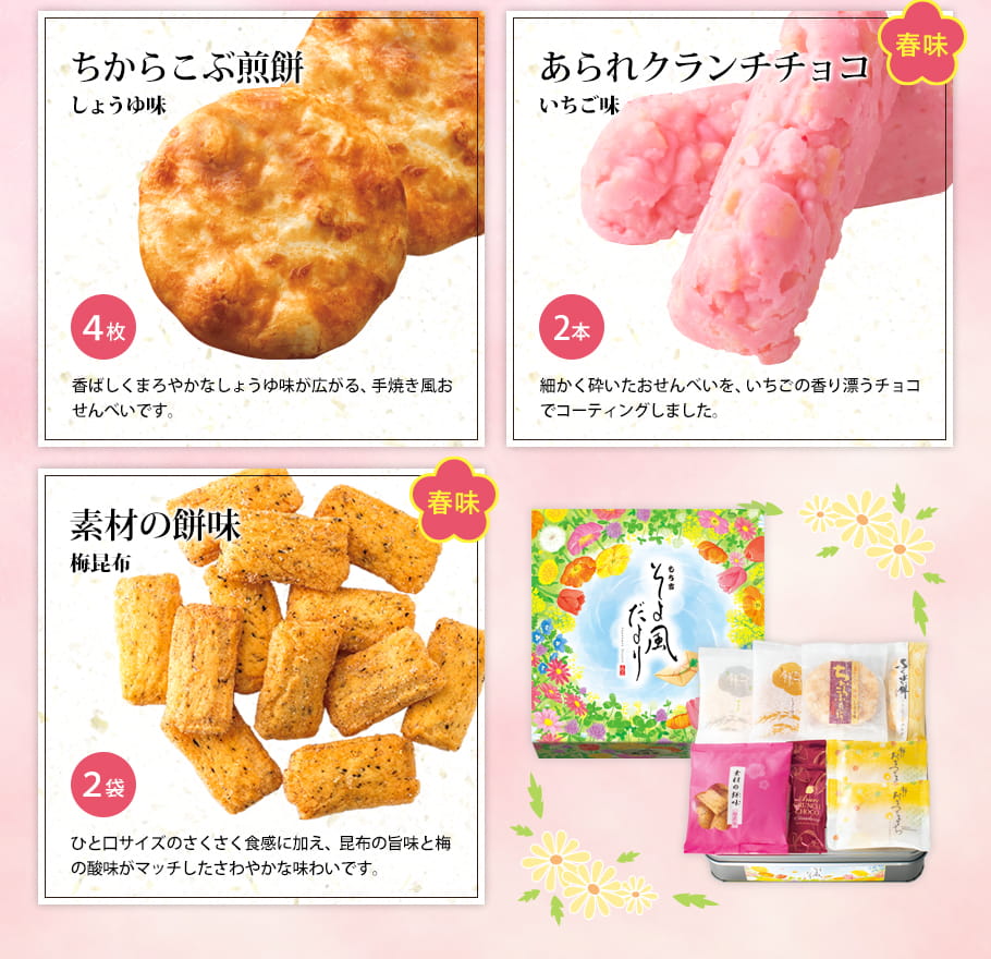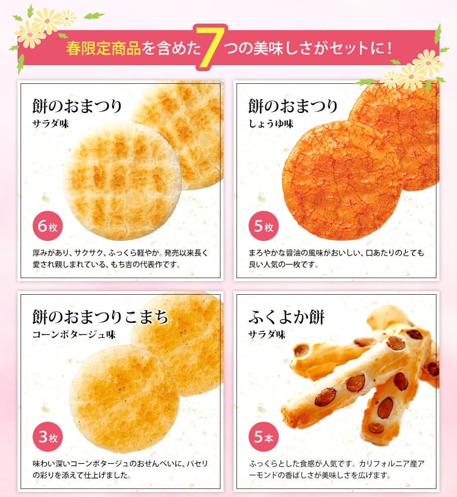 +内容 | 7種27袋 ・餅のおまつり(サラダ味6枚、しょうゆ味5枚) ・餅のおまつりこまち(コーンポタージュ味3枚) ・ふくよか餅(サラダ味5本) ・ちからこぶ煎餅(しょうゆ味4枚) ・あられクランチチョコ(いちご味2本) ・素材の餅味(梅昆布18g×2袋) |