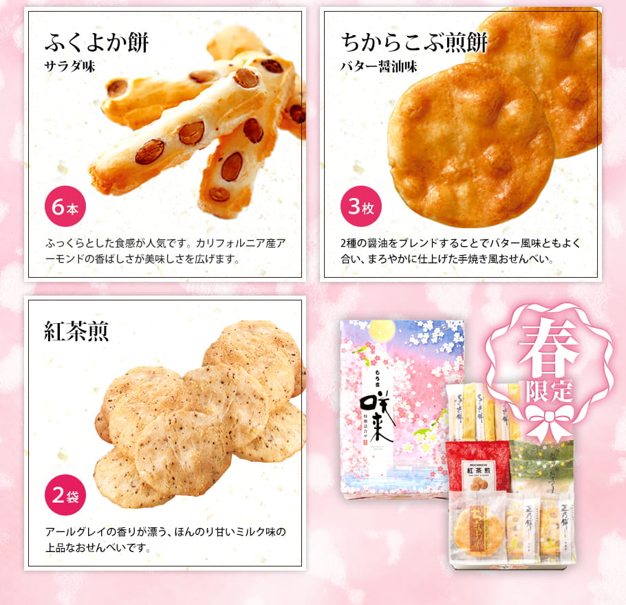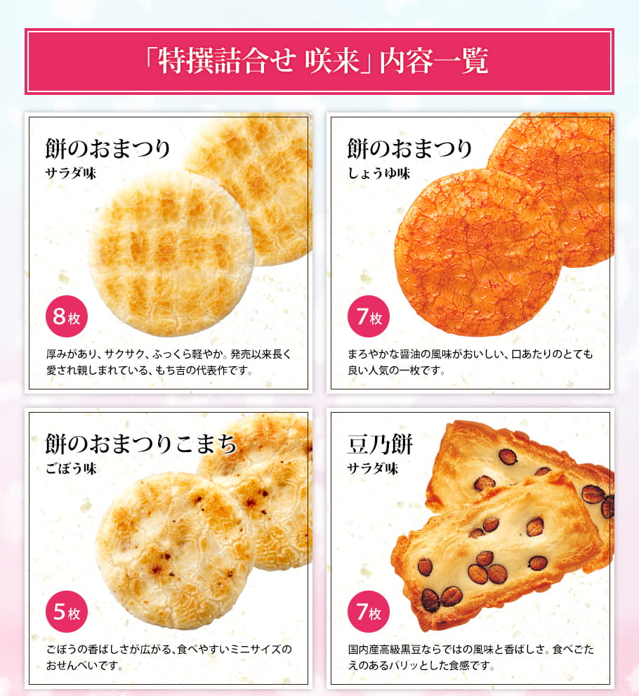 +内容 | 7種38袋 ・餅のおまつり(サラダ味8枚、しょうゆ味7枚) ・餅のおまつりこまち(ごぼう味5枚) ・豆乃餅(サラダ味7枚) ・ふくよか餅(サラダ味6本) ・ちからこぶ煎餅(バター醤油味3枚) ・紅茶煎(9g×2袋) |
