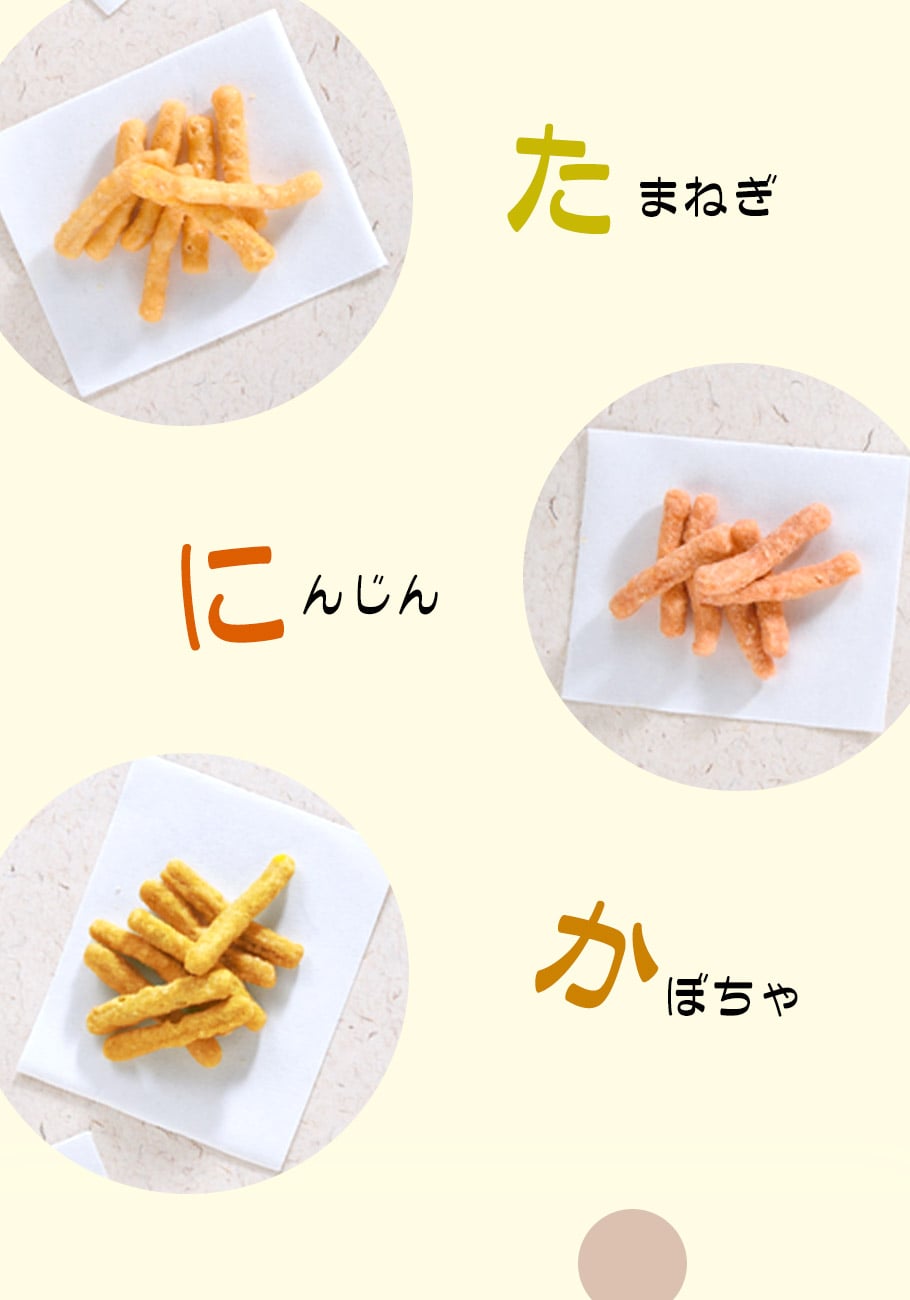 +原材料名 | 小麦粉(国内製造)、グラニュー糖、植物油脂、黒砂糖、水飴、さつまいも粉末、脱脂粉乳、かぼちゃ粉末、にんじん粉末、ほうれん草粉末、たまねぎ粉末、食塩、醤油、イースト、ピーナッツ粉末、胡麻/クチナシ色素、紅麹色素、(一部に小麦・乳成分・落花生・ごま・大豆を含む) |