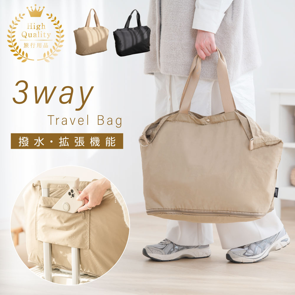 【便利な拡張機能バッグ/持ち運び3WAY】宿泊日数や荷物の量に合わせてサイズアップできるボストンバッグ。持ち運びは手持ちトート、ショルダー、スーツケースへのキャリーオンの3WAY。旅の負担を少しでも軽減する約350gの軽量設計。小さく折りたためて携行にも便利です。