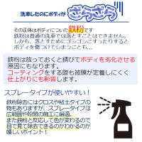 洗車後にボディを触るとザラザラする、その原因となる鉄粉汚れを簡単に除去できる鉄粉除去剤です。スプレーすると鉄粉やブレーキダストなどの金属汚れに反応し紫色へ変化。汚れを可視化しながら除去できるため、初めての方でも状態を確認しながら洗車できます。