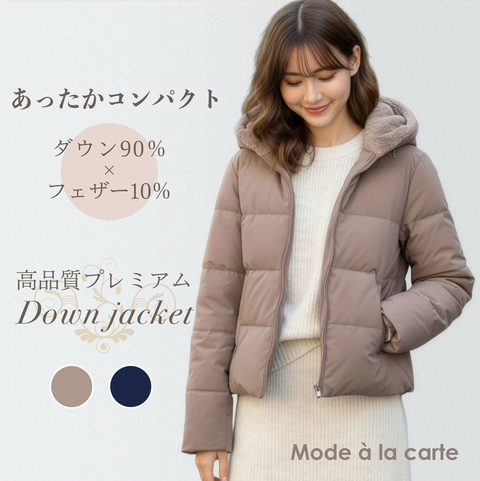 冬のおしゃれを軽やかに彩るファーフード付きショート丈ダウンジャケット。