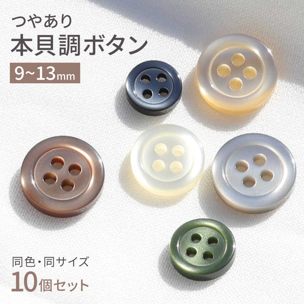 本貝調ボタン シェルボタン 9mm 10mm 11.5mm 13mm 10個セット 割れにくい ツヤあり 四つ穴 シャツ ジャケット 手芸 白 グレー 茶色 緑 VSO9001