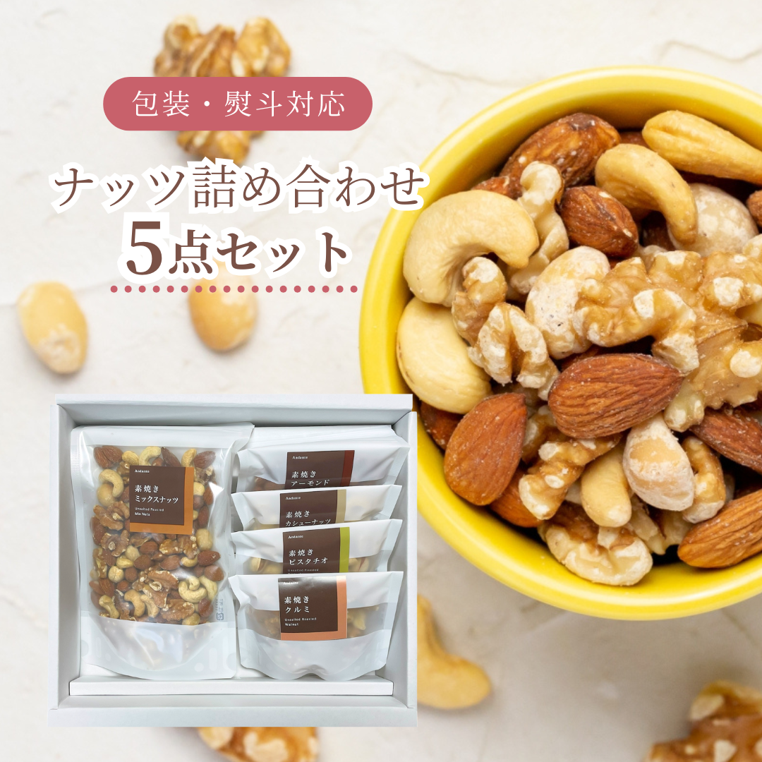 | 内容量 | (1)素焼きミックスナッツ:160g (2)(3)(4)(5)素焼きアーモンド、素焼きカシューナッツ、素焼きピスタチオ、素焼きクルミ:50g