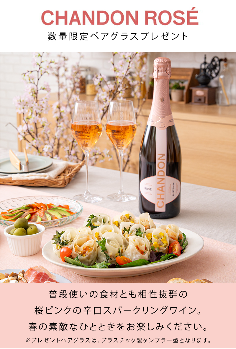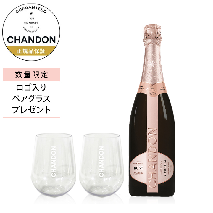 | 商品特長 | シャンドン ロゼは伝統的製法で造られた、スパークリングワインです。新鮮なイチゴ、ざくろ、チェリーを思わせるアロマと爽快なフィニッシュを持ち、フレッシュな風味と、伸びやかな酸味のあるロゼです。 【公式店限定・割れにくいペアグラス付!】ピザなど様々なお食事に合う辛口ロゼスパークリングで、行楽やギフトに。 |