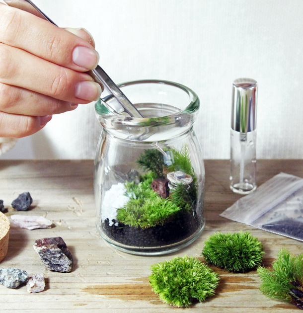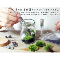 7.5×5.6cmのコルク蓋付きガラス瓶の中に、日本庭園を手づくりできる苔テラリウムのキットです。