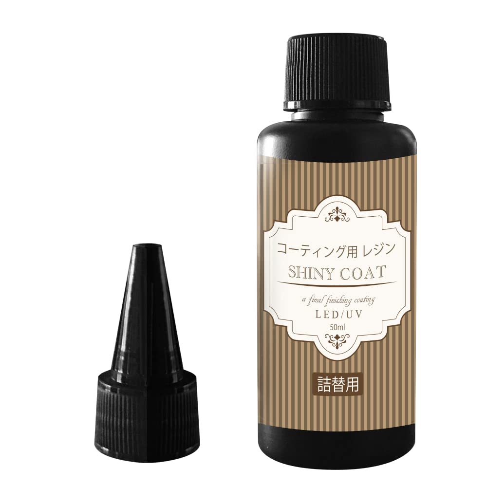 | 主な仕様 | 最新ブラシ付きコーティング剤 詰め替え用50mlコーティング用レジン シャイニーコート】 UV/LED ハンドメイドレジン作品などのハンドメイドに使えるコーティング剤です。 濡れたような美しい艶が生まれます!! ドライフラワーのコーティングや、「着色剤いろっちゃ」で描いたアートのコーティング剤としてお使い頂けます。 コーティングしたい作品に塗布し、LEDで30秒〜またはUVライトで60秒〜硬化させて下さい。 夏場は樹脂が温められますので粘土が低くなり気泡が抜けやすいですが、冬場は冷たい気温で樹脂の粘土が高くなり細かい気泡が出来やすくなります。 冬場にご使用の際はなるべく室温の高い環境でご使用くださいませ。こちらは詰め替え用 50mlです。ノズルはありますが、ブラシはついていません |