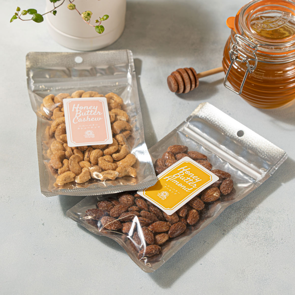 [栄養成分表示(100gあたり)]ハニーバターカシューナッツ:エネルギー592kcal たんぱく質 17.6g 脂質 42.8g 炭水化物 34.2g 食塩相当量 0.4gハニーバターアーモンド:エネルギー611kcal たんぱく質 17.6g 脂質 46.8g 炭水化物 29.9g 食塩相当量 0.6g