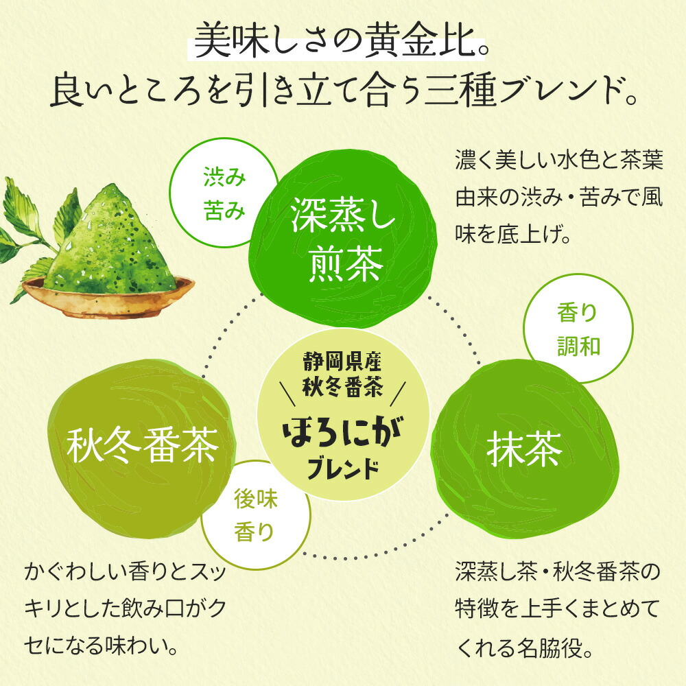 さらに、すっきりとした後味の秋冬番茶をブレンドし、滋味深い味わいに仕上げました。