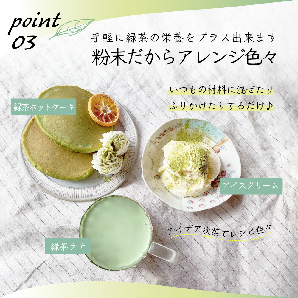 緑茶ラテやホットケーキ、アイスクリームにも混ぜて、毎日の食卓に栄養と彩りをプラス。