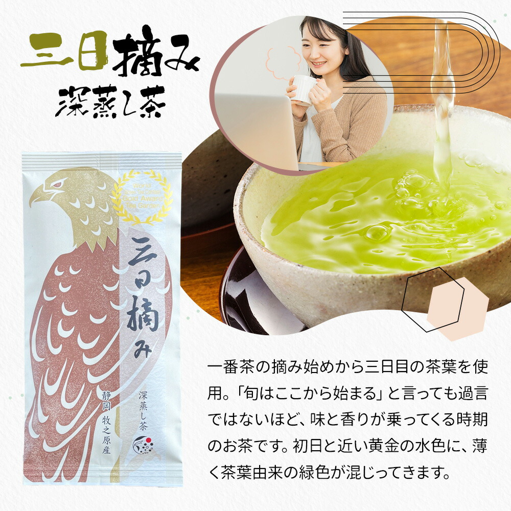 摘み始めから三日目の茶葉を使用し、旬の味わいが際立つお茶。