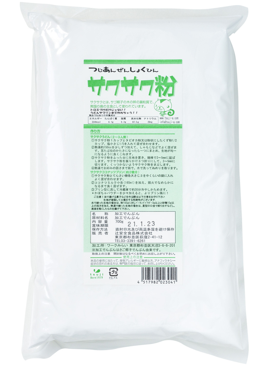 サクサク粉はサゴやしの幹から採れるでん粉で、パプアニューギニアの原住民の人々の大切な主食です。加熱するとくず状になり、うどんなどの麺類やプリンなども作れます。