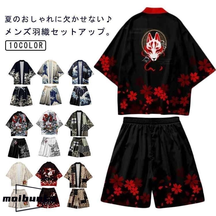 メンズ夏上下セット セットアップ 半被 甚平 はっぴ ショートパンツ 和風 法被 カーディガン 浴衣 おしゃれ 和柄 着物風 荒波 海 半纏 じんべ