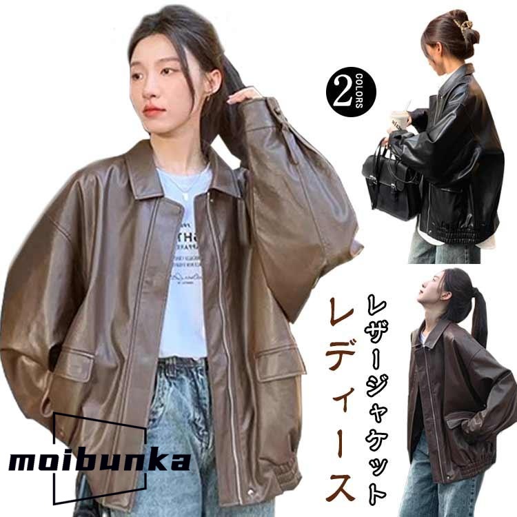 ライダース 革ジャン コート ジップアップ レザージャケット ブルゾン フェイクレザー きれいめ オーバーサイズ 合皮 レディース ジャケット 革ジャ