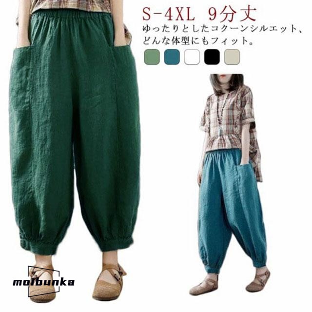 サルエルパンツ レディース 夏 ズボン 9分丈 ドッキング 綿麻風 テーパードパンツ ウエストゴム ハイウエスト ポケット ゆったり 大きいサイズ ボ