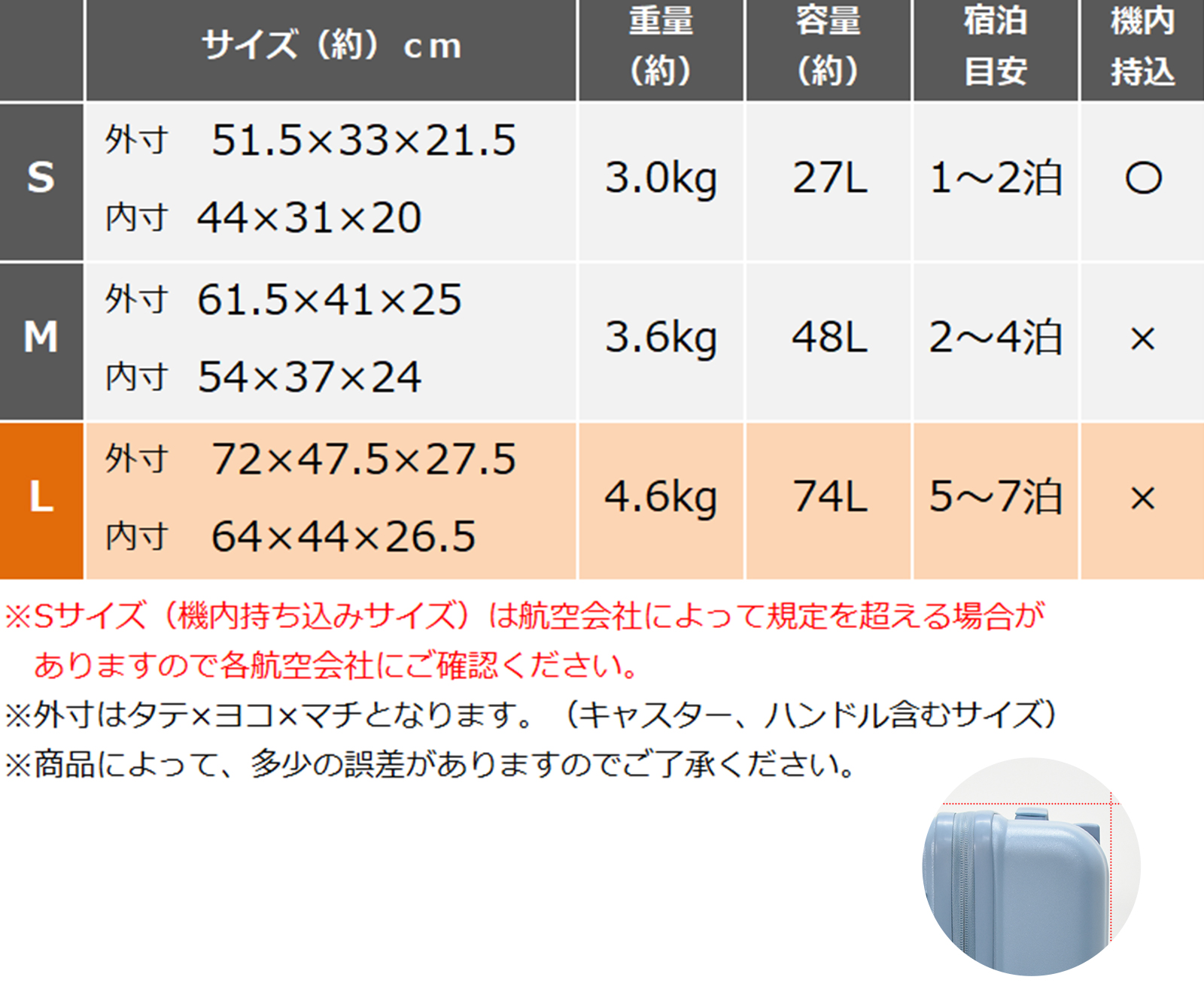 外寸約72x47.5x27.5cm ※ハンドル・キャスター・カギなどを含みます。