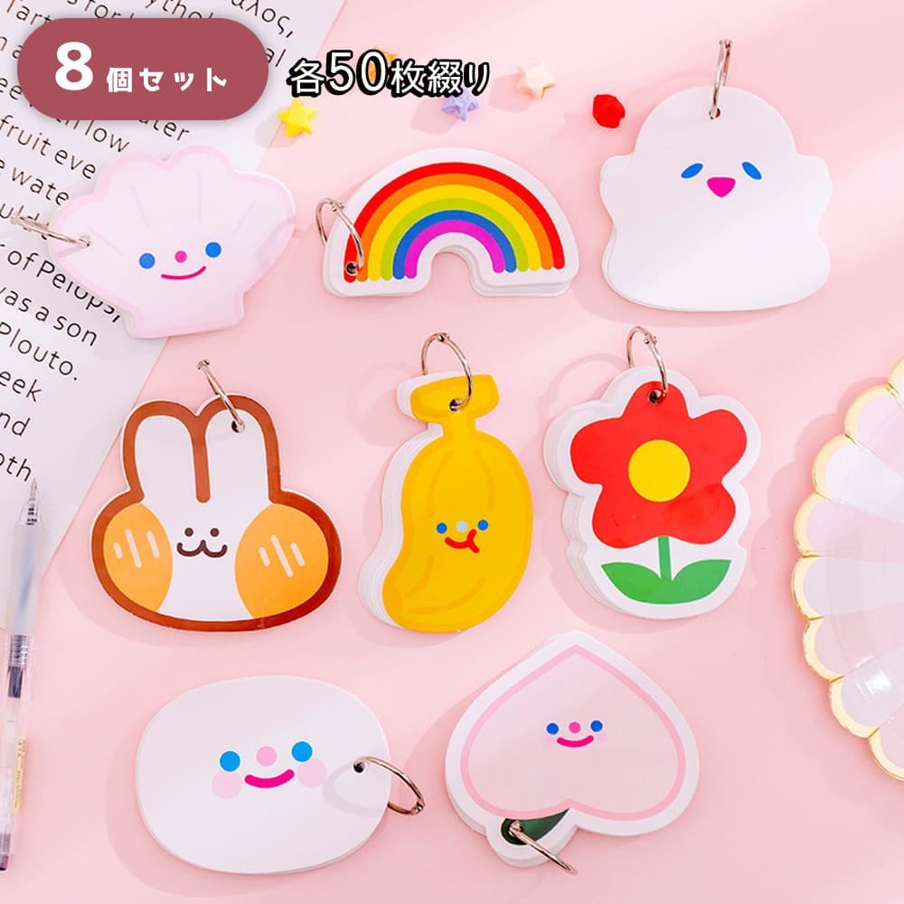 単語帳 単語カード 暗記カード 8種セット 50枚綴り 無地 400枚 大量 徳用 メモ レター (バナナ/花/貝殻/桃/虹/お化け/うさぎ/餅)