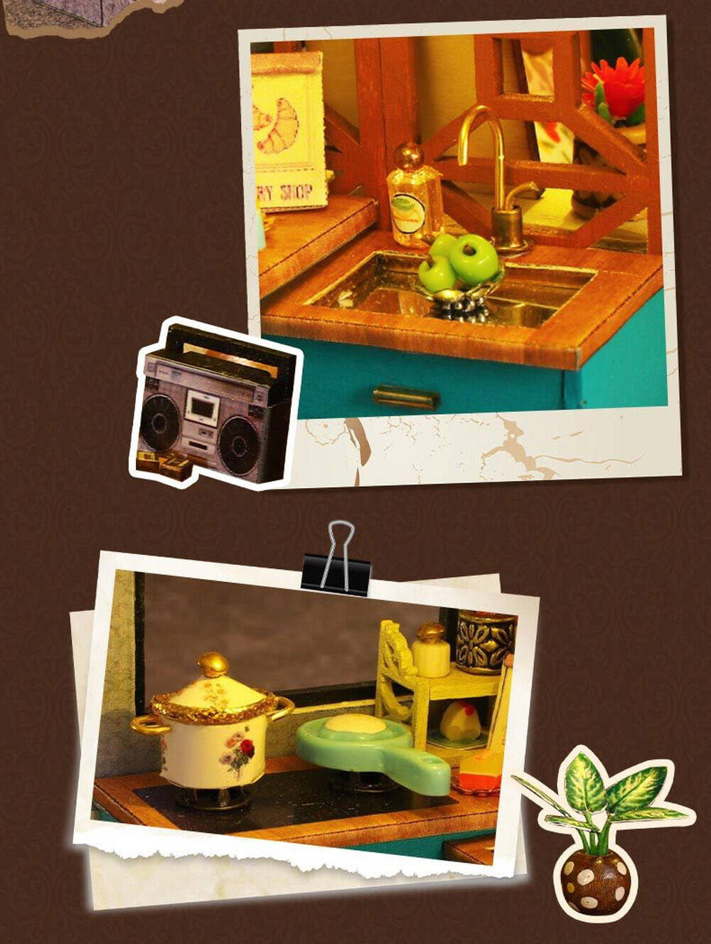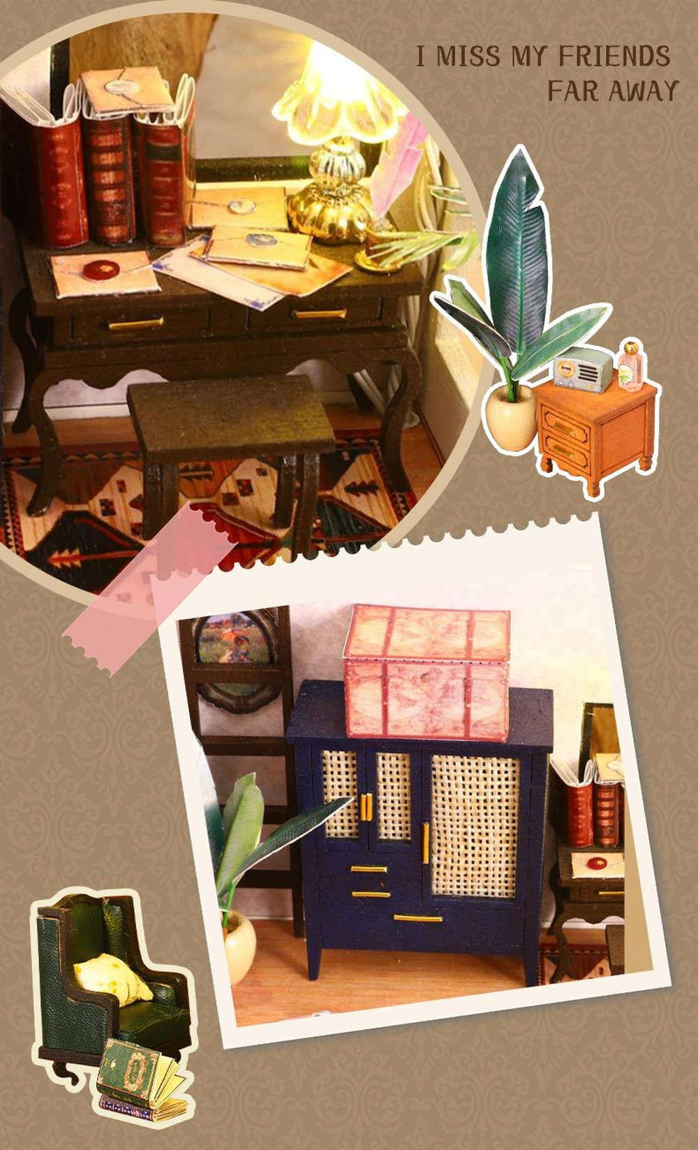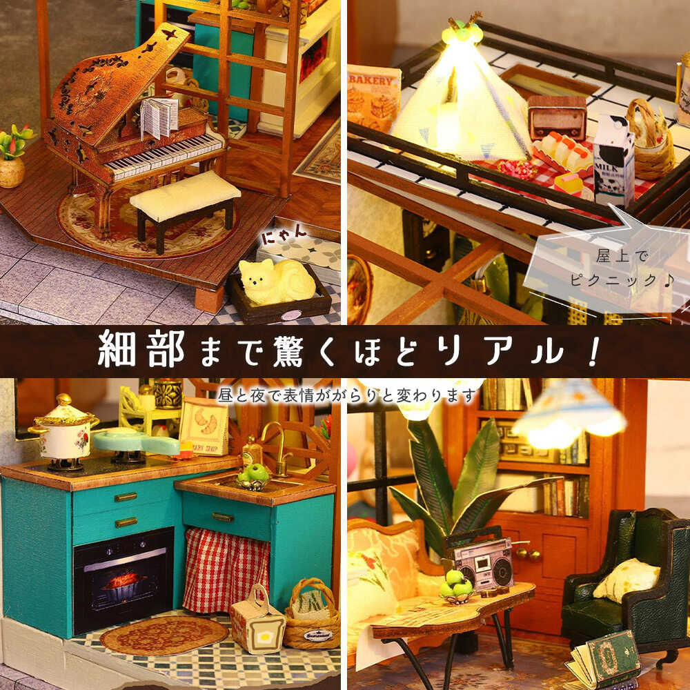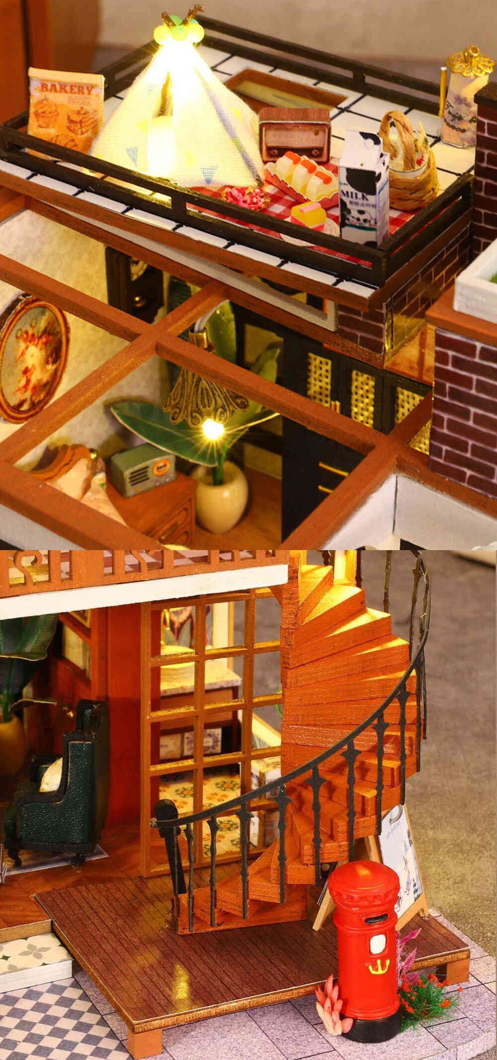 ドールハウス ミニチュア 手作りキット セット 英語説明書 アンティーク レトロ レンガ 赤 郵便ポスト 猫 テディベア 屋上|LEDライト+アクリルケース+フ