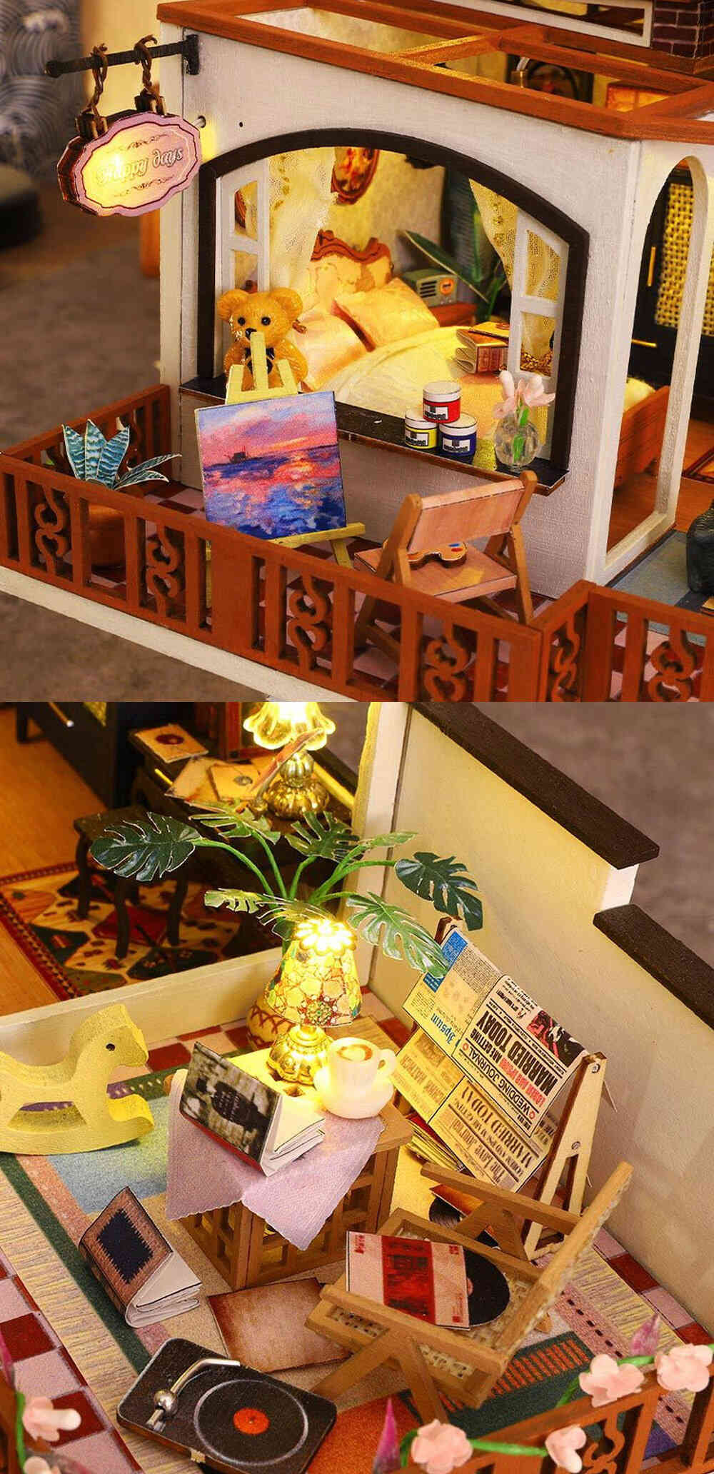 1/24スケールのミニチュアドールハウス手作りキットです。優しい灯りが暖かい雰囲気を演出し、細部まで丁寧に作られた二階建てのデザインが魅力的。階段やテラス、小物も充実しており、手作りの楽しさと飾る喜びが詰まった一品です。