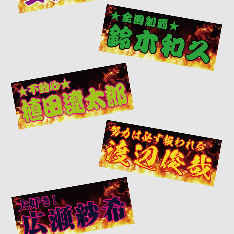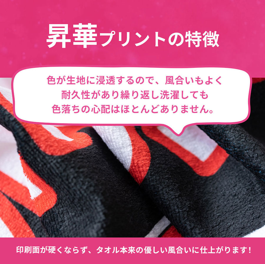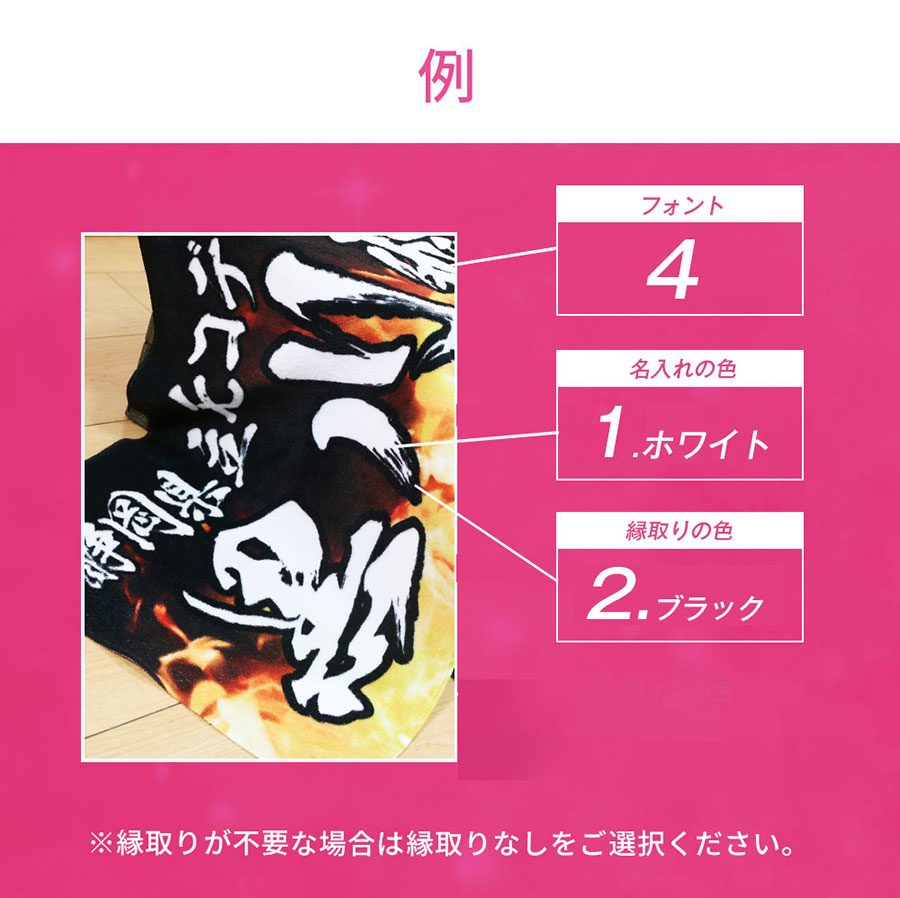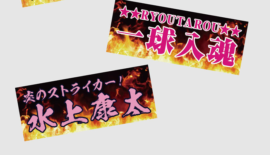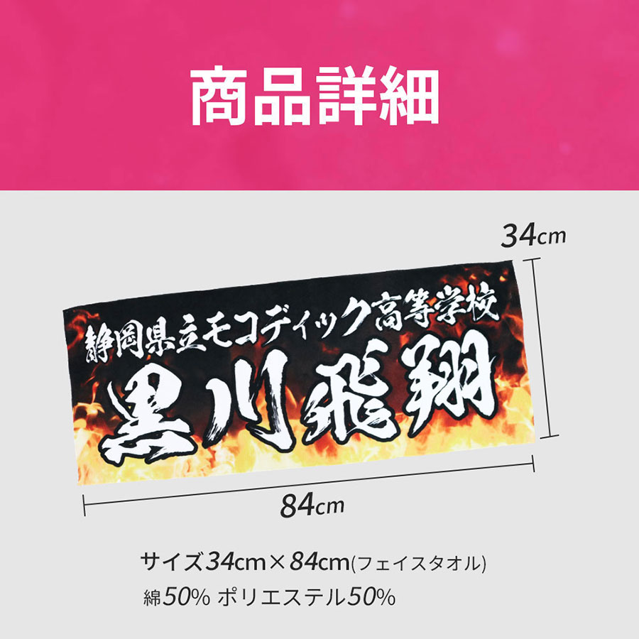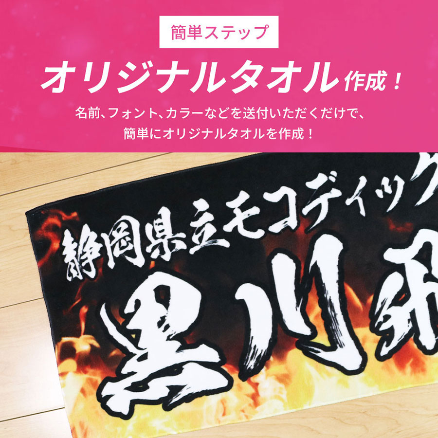 かっこいい炎デザイン入りだから、好きな文字を指定するだけでデザイン性の高いオリジナル全面名入れタオルが作成できます。