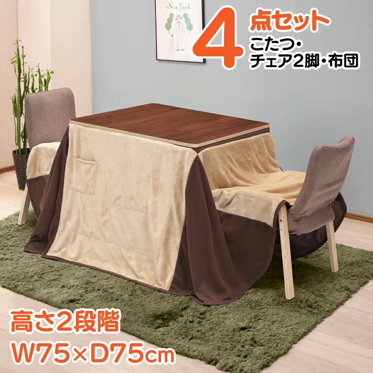 ■サイズ こたつ:W750×D750×H400/670mm チェア:W530×D430×H730mm 座面高:100/390mm ■商品重量 32kg ■耐荷重 20kg ■梱包サイズ 梱包1:W790×D790×H170mm 梱包2:W900×D440×H260mm ■梱包重量 35.5kg ■カラー ナチュラル/ダークブラウン ■材質 【こたつ】 天板:メラミン化粧板 脚:積層合板 ヒーター:U字形石英管ヒーター(MH-303H、定格電圧:消費電力300W) 布団:フランネル生地 ポリエステル100% フラップ部分 フリース ポリエステル100% 【チェア】 張地:ファクブリック(ポリエステル100%) ウレタン、鉄フレーム 脚:積層合板 ■機能 テーブル:高さ2段階調整、リバーシブル仕様(NA/DBR) ヒーター:中間スイッチ付、可変式サーモスタット機能 こたつ布団:リバーシブル仕様(BE/DBR) チェア:高さ2段階調整、3段階リクライニング ■組立有無 有り(組立品)※お客様組立の商品です。 ■配送 エレベーターなしの場合、別途階段上げ料が発生します。また、配送の時間指定は出来ません。ご了承ください。メーカー在庫品の為、取寄元の在庫が品切れの場合は、注文をキャンセルさせていただきます。 ■注意事項 この商品は大川民芸家具ではございません。予めご了承ください。 ■備考 こたつ、こたつ布団、チェア2脚のセット商品です。