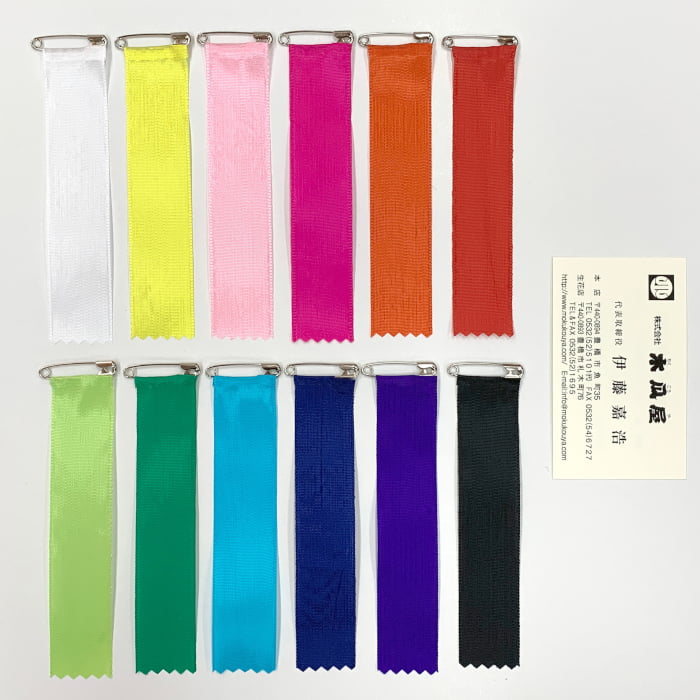 | リボン記章の豆知識 ・タレに名前を書く場合は、リボン記章は本人が付ける物ですので、通常は敬称(様・先生など)は記入しません。 ・タレに名前を書く場合は、墨をよくすって濃くするとにじみにくくなり書きやすくなります。 |