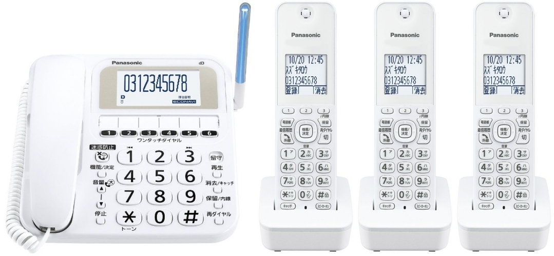 親機:約3.5型※1特大数字 ホワイトバックライト液晶文字が大きく、高コントラストの約3.5型※1ホワイトバックライト液晶を採用。見やすい表示画面です。親機:大きなダイヤルボタン使いやすい大きなダイヤルボタン。文字も大きく数字が見やすくなっています。ワンタッチダイヤル6件搭載(手書きで記入できるワンタッチダイヤルカード付)デジタル留守録(最大約12分、最大50件まで)[聞こえる]親機(受話器)の受話音量が6段階となり、従来の3段階より受話音量を大きく設定できるようになりました。[あんしん]振り込め詐欺や迷惑電話の防止対策に「迷惑防止※2」を設定すると、着信音が鳴る前に本機が応答して、相手に通話を録音するというメッセージを流します。着信中は呼出音と注意喚起のアナウンスを交互に繰り返し、電話に出ると通話内容を自動で録音します周囲の音で呼出音が聞きとりづらいときでも、着信お知らせLEDが光って着信をお知らせ