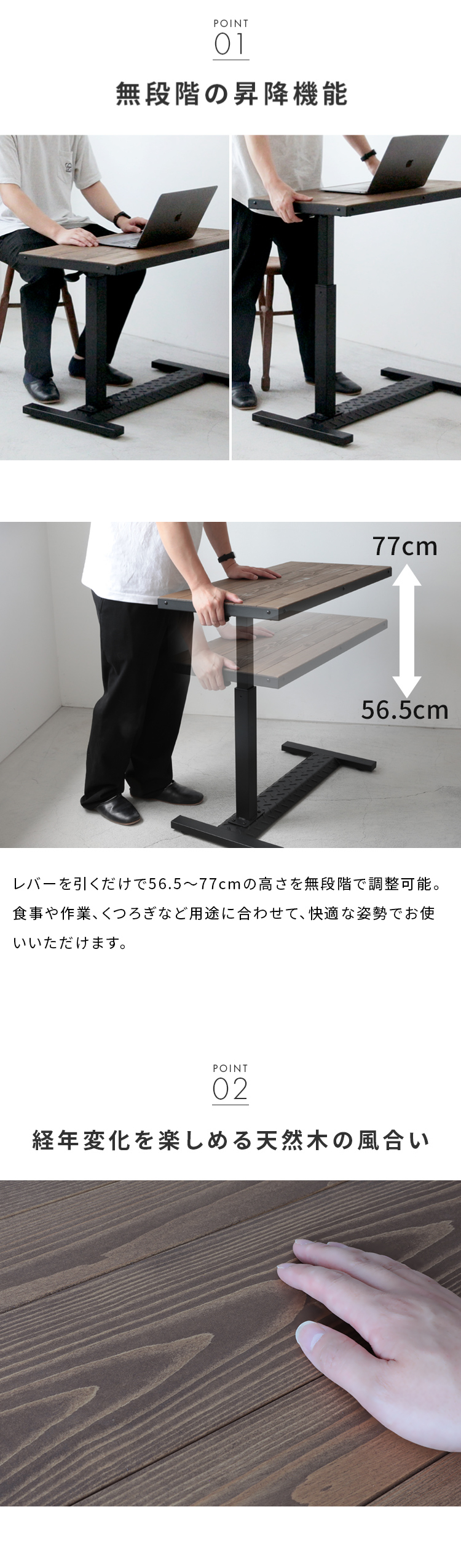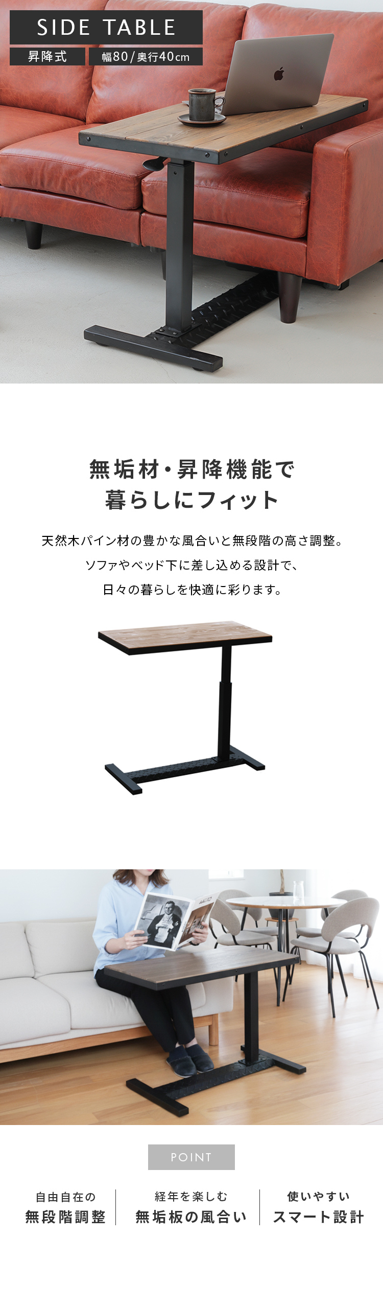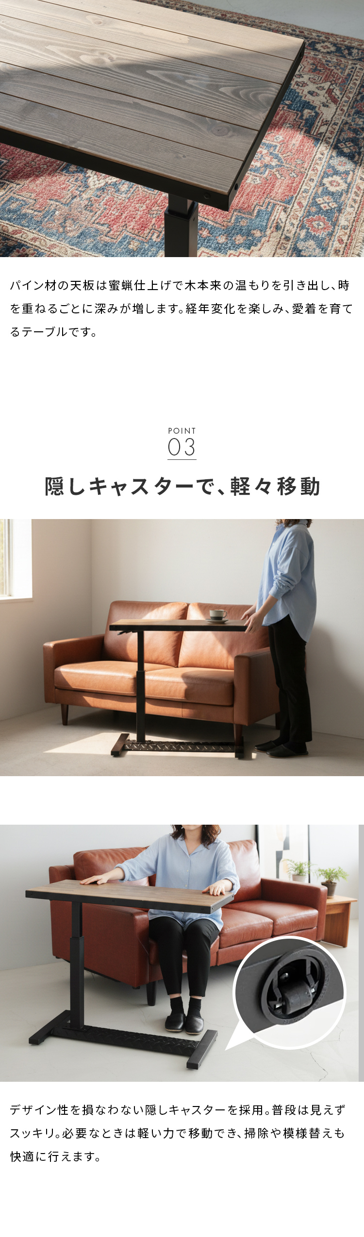 天然木パイン材の豊かな風合いと無段階の高さ調整。ソファやベッド下に差し込める設計で、日々の暮らしを快適に彩ります。