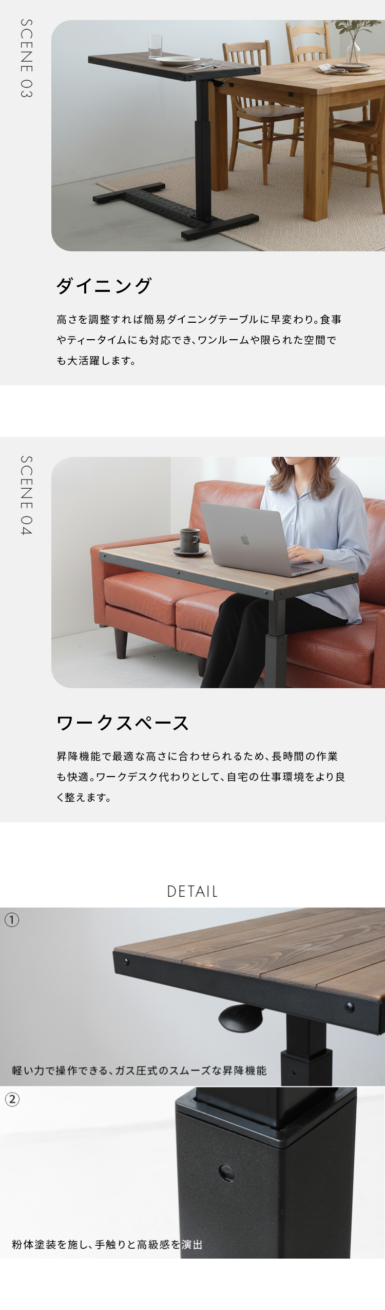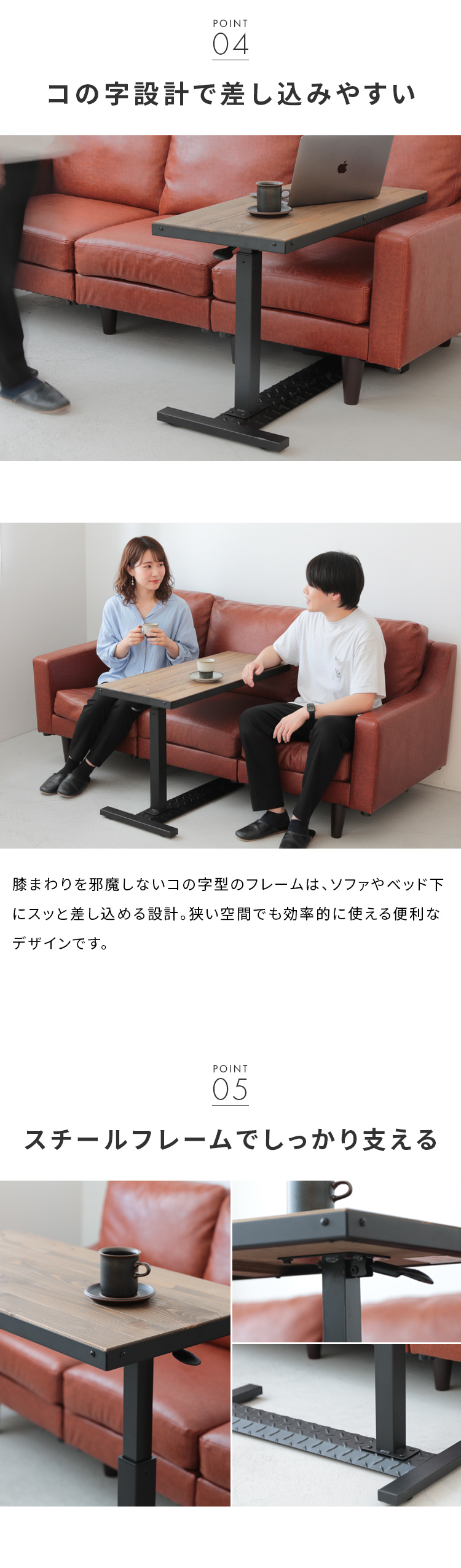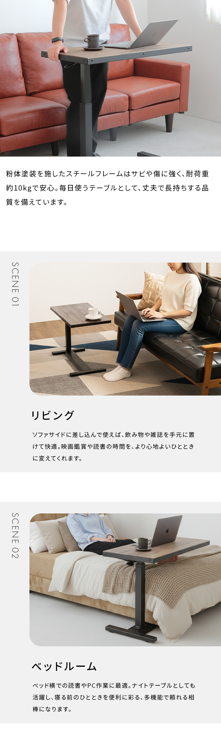 天然木パイン材の豊かな風合いと無段階の高さ調整。ソファやベッド下に差し込める設計で、日々の暮らしを快適に彩ります。