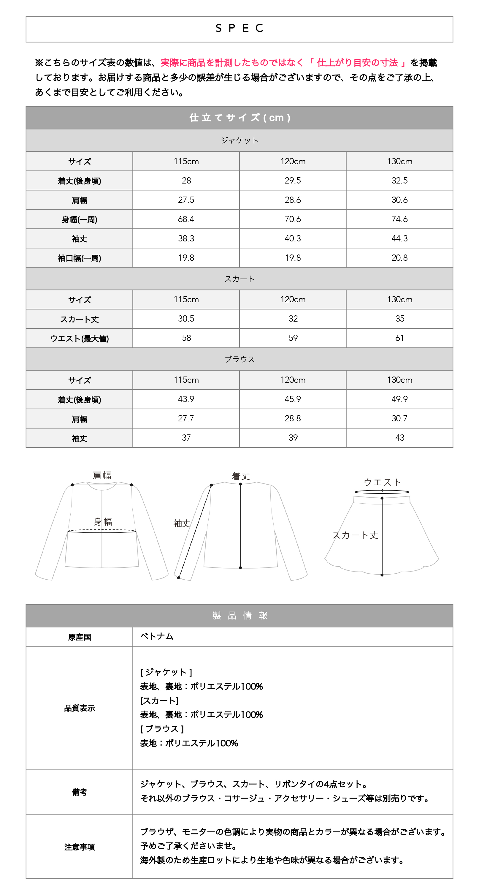 ジャケット+スカート+ブラウス+リボンタイの4点セット。