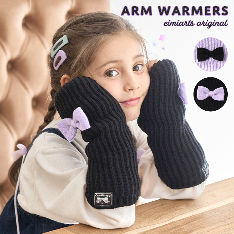 アームウォーマー アームカバー 子供 キッズ 手袋 女の子 リボン [ 冬用 ニット 子ども 防寒 裏起毛 ファー ラベンダー 紫 ブラック 黒 メール便可]