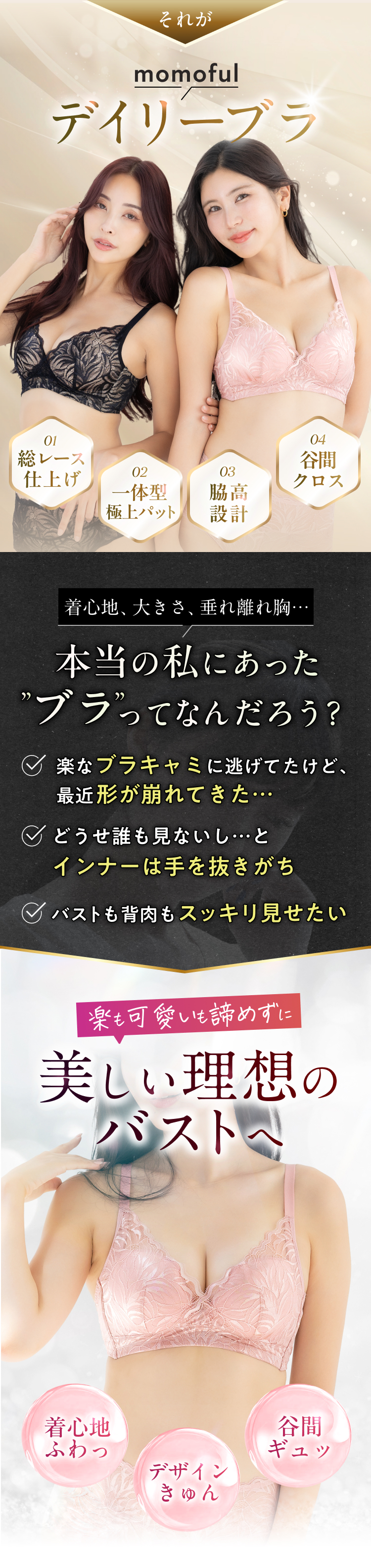 モモフルは、品質と快適さに長年にわたりこだわり続けています。デイリーブラは全女子がきゅんとくる可愛いレースを使用し、透け感・胸の立体感・着用感にもこだわりました。機能性とかわいさを追求したデイリーブラ -elegant- を試して、快適な生活を手に入れましょう。