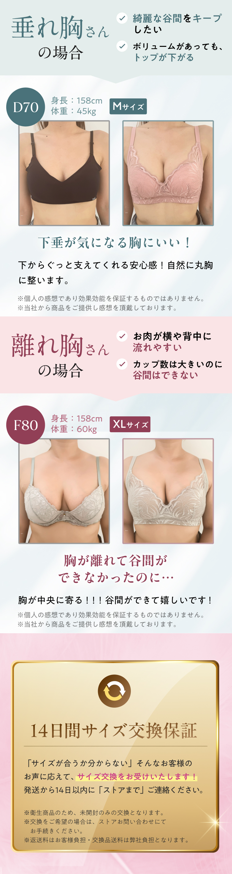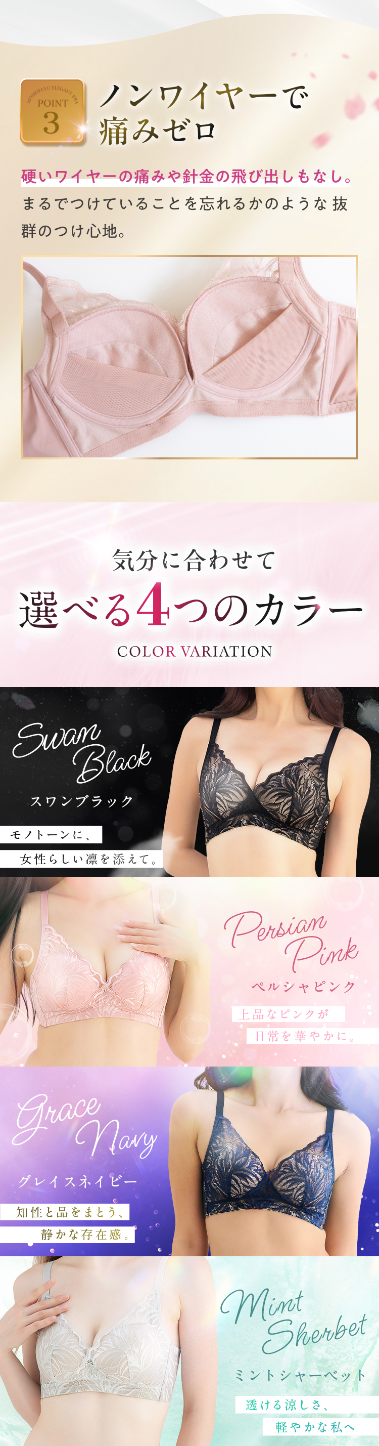 加齢や産後の下垂ケアをしたい方、美しいバストを保ちたい方、機能性もデザイン性も大事な方、おりもの吸水ショーツelegantを愛用の方など、幅広い女性に向けて開発されました。皆様からの熱いご要望を形にした「デイリーブラ -elegant-」は、あなたもきっと虜になることでしょう。 是非お試しください。