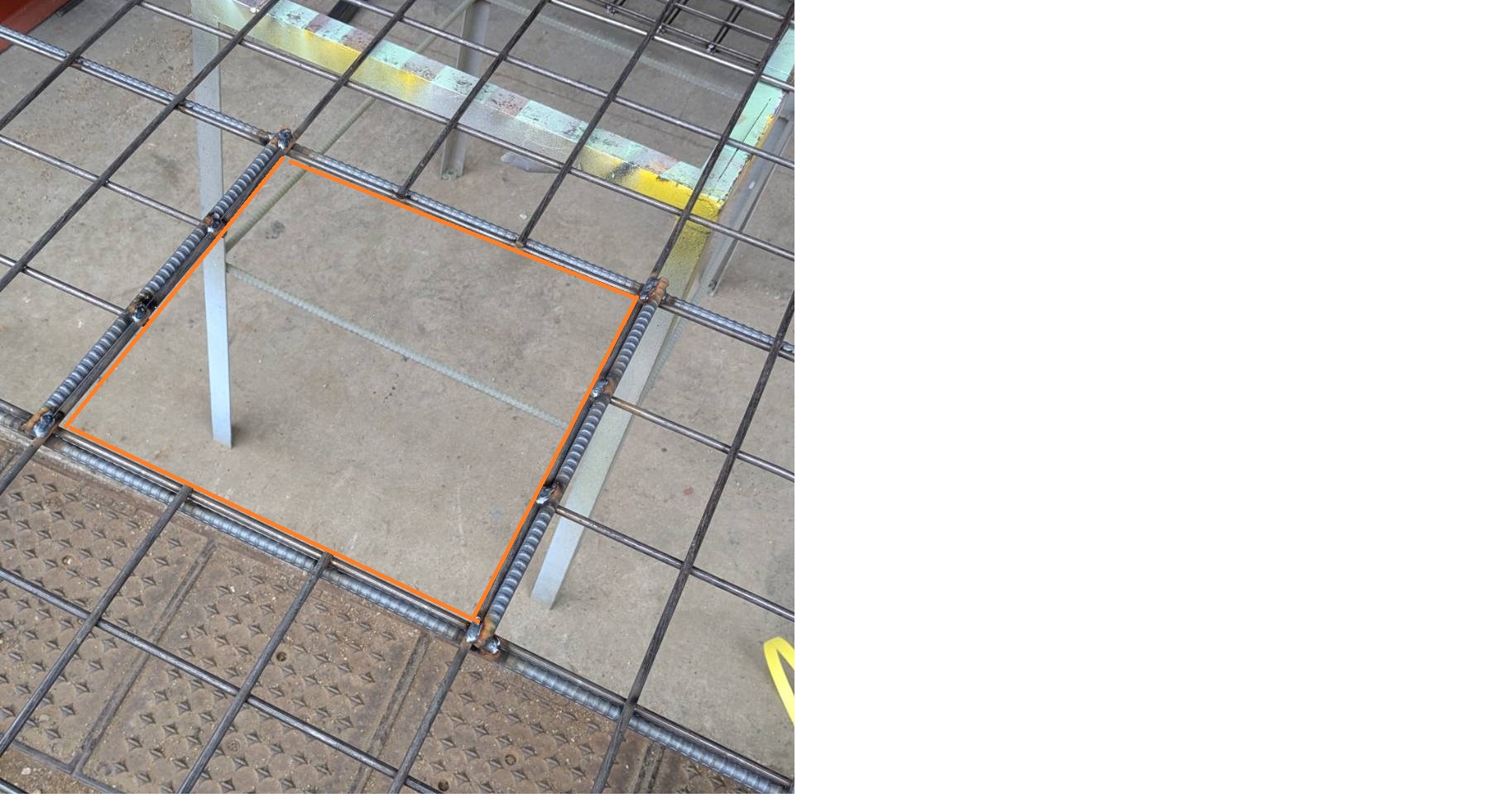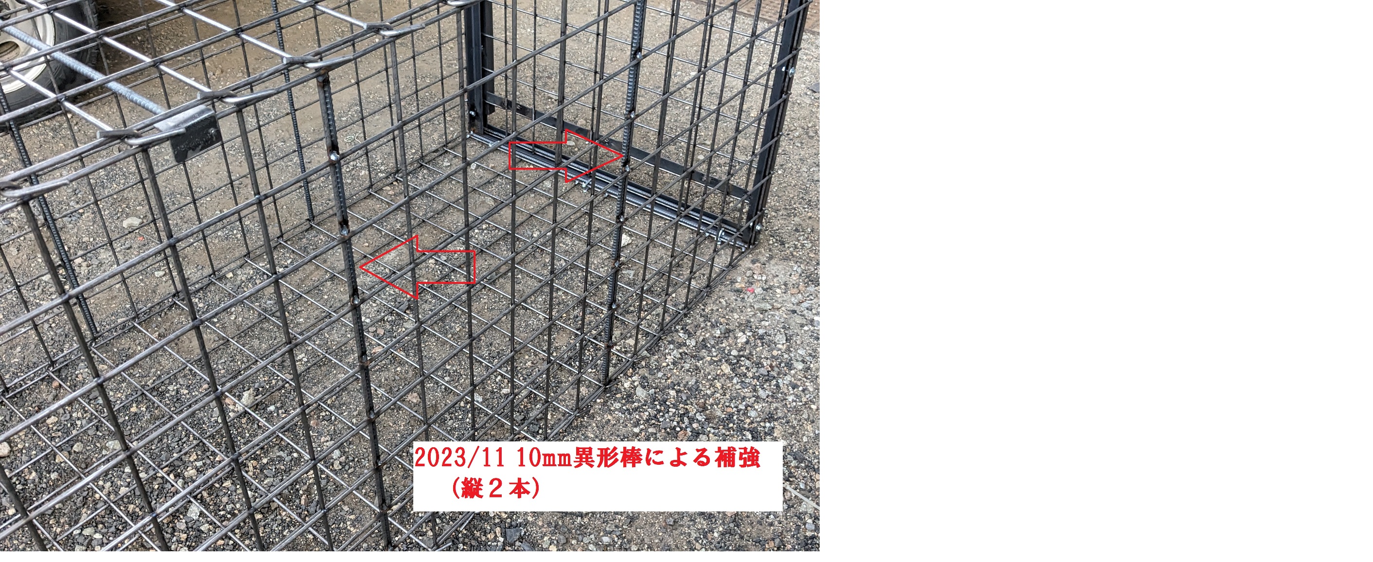 10mm鉄筋で補強を行います。横方向端まで90cmx2本、及び縦方向30cmx2本(はしご型)または、類似する補強。
