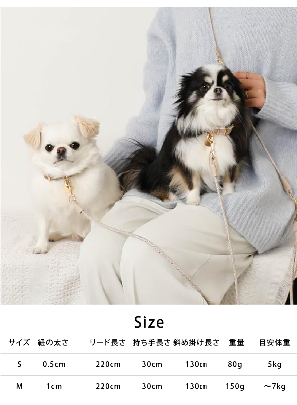 | サイズ | 紐の太さ(cm) | リード長さ(cm) | 持ち手長さ(cm) | 斜め掛け長さ(cm) | 目安体重(kg) |