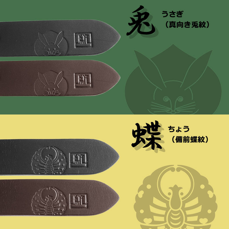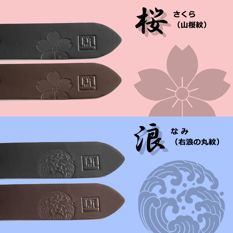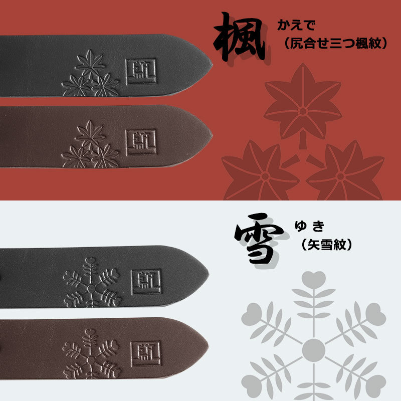 剣先(ベルト先端)には全8種から選べるMONCRESTオリジナル紋の刻印を入れました。
