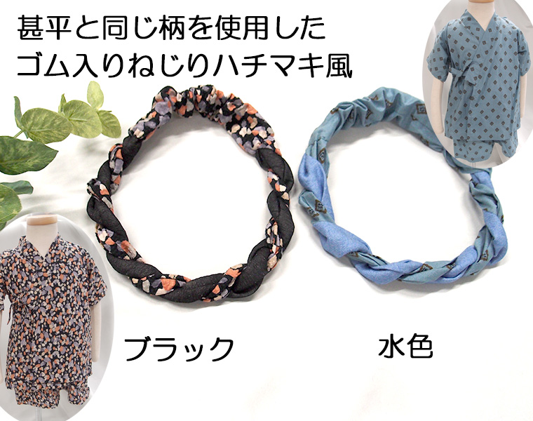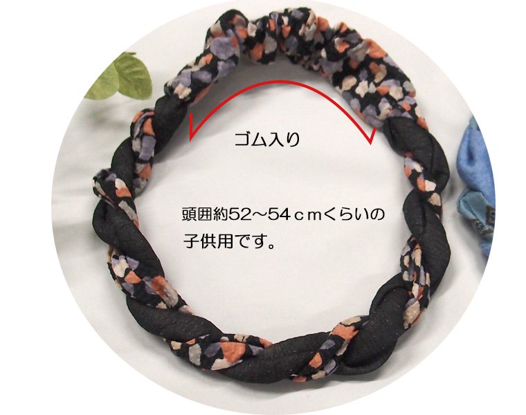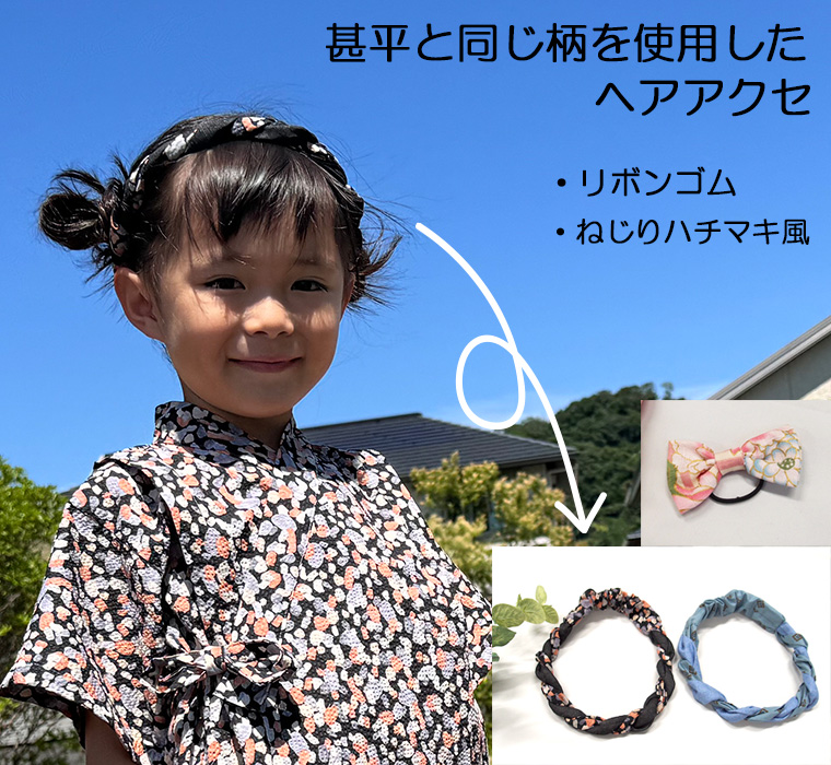 | 甚平柄と同じ生地でお作りした子供用リボンとハチマキです。 リボンゴムは直径3cmの子供用のゴムを使用しています。 ハチマキは頭囲52〜54cmぐらいの子供用です。 同じ柄の甚平と合わせても◎ |