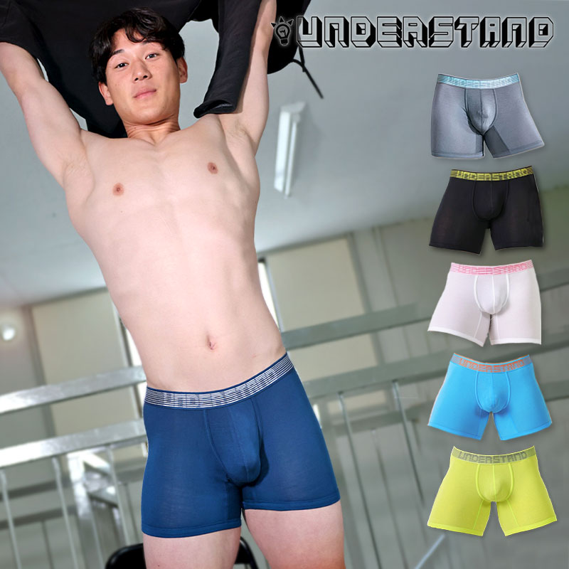 | ストロボ STROBESCOPE その一瞬を切り取るマジカルなロゴパンツ。 ウエストバンドにピンストライプを施した定番スタイルのパンツ。でもそこに大きなロゴが見え隠れ。一度だけじゃ済まない、二度見させる下着。世界はただ見てるだけじゃわからないこともある。瞬きした瞬間や通り過ぎる時間の中に急にしっかり見えてくることだってある。沢山の色が重なり合ったり繋がったりした途端鮮やかに浮かんでくるモノだってある。 モダールによる鮮やかな色の取り合わせと視界のフシギをキュッと詰め込んだパンツです。このバンドはがんばって近づくほど分からなくなるけど、一息ついて眺めると、静かにでもしっかりとメッセージが見えてきます。だから走ったり転んだり、動いて泣いて笑ったりしたら、あぁ!って「わかる」パンツなのです。 パッと光が当たって、U N D E R S T A N D の10文字がクッキリ表れるのは、キミの姿丸ごと全部見えるところ。アンダーパンツのイリュージョンです。 モモフィッター/クラッシックさにイロを添える新感覚ロングボクサー アンダースタンドのモモフィッター アンダースタンドラインの生地の良さを一番実感できるアイテムです。厚過ぎず薄過ぎず、柔らかくても自然に体に密着してホールドしてくれます。 ヒップ全体から太腿上部まで丸ごと包み込むスタイルなので1日穿いても気にならず、また、動き回っても心地よく下半身をサポートします。 ボクサーに比べても股間周辺の安定感は優秀、それでも肌触りの良いこの生地が程よく体に馴染んで自然な着心地。ロングスタイルのアンダーウェアは、体の輪郭を大きく左右するアイテム。だから、弛んだり硬過ぎたりしては台無しですが、もちろんアンダースタンドのシリーズだからヒップからフロントセンターに至るまでしっかりフィットするカッティングになっています。