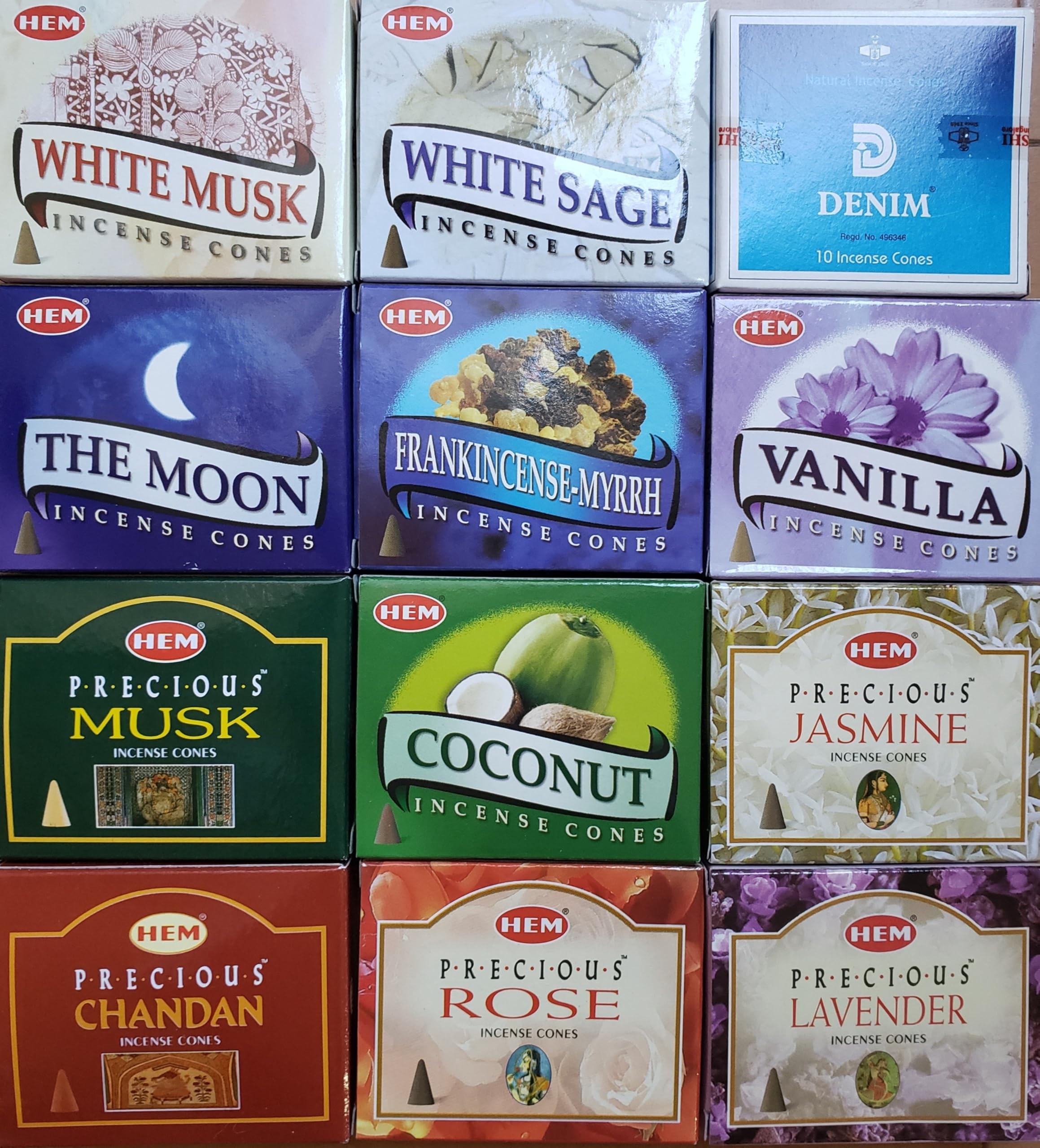 チャンダン・ジャスミン・ラベンダー・ローズ・フランキンセンス ミルラ・ホワイトセージ・ホワイトムスク・ココナッツ・バニラ・ムーン・ムスク・デニムを各1箱計12箱セット