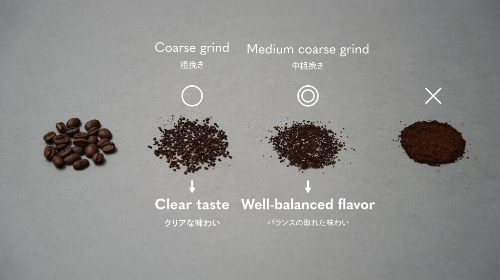 豆は中粗挽きのものを使用するのがおすすめです。バランスの取れた味わいを抽出できます。目詰まりしにくいため、お手入れもしやすく、よりコーヒーらしい香りを楽しむことができます。